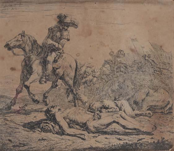 (Amsterdam 1622 - Venezia 1678) CAMPO DI BATTAGLIA CON CAVALIERE Acquaforte, mm. 170 x 196