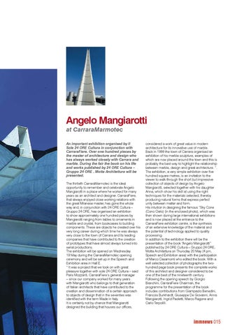 considered a work of great value in modern architecture for its innovative use of marble. Back in 1999 the town of Carrara organised an exhibition of his marble sculpture, examples of which are now placed around the town and this is probably the best way to highlight the relationship between marble, design and great architecture. ”. The exhibition, a very simple exhibition over five hundred square metres, is an invitation to the viewer to walk through the short but impressive collection of objects of design by Angelo Mangiarotti, selected together with his daughter Anna, which show his skill at using the right techniques for the materials selected, thereby producing natural forms that express perfect unity between matter and form. His intuition in designing the famous “Sky Cone (Cono Cielo) (in the enclosed photo), which was then shown during large international exhibitions and is now placed at the entrance to the CarraraFiere exhibition centre, is the synthesis of an extensive knowledge of the material and the potential of technology applied to quality processing. In addition to the exhibition there will be the presentation of the book “Angelo Mangiarotti” published by 24 ORE Cultura – Gruppo 24 ORE, Motta Architettura on Thursday 20 May (4 pm, Speech and Exhibition area) with the participation of Marco Casamonti who edited the book. With a well selected collection of photographs the twohundred page book presents the complete works of this architect and designer considered to be one of the best of the nineteenth century. Following the opening speech by Giorgio Bianchini, CarraraFiere Chairman, the programme for the presentation of the book includes contributions from Giampaolo Benedini, Francois Burkhardt, Giuseppe De Giovanni, Anna Mangiarotti, Ingrid Paoletti, Marco Ragone and Carlo Terpolilli.