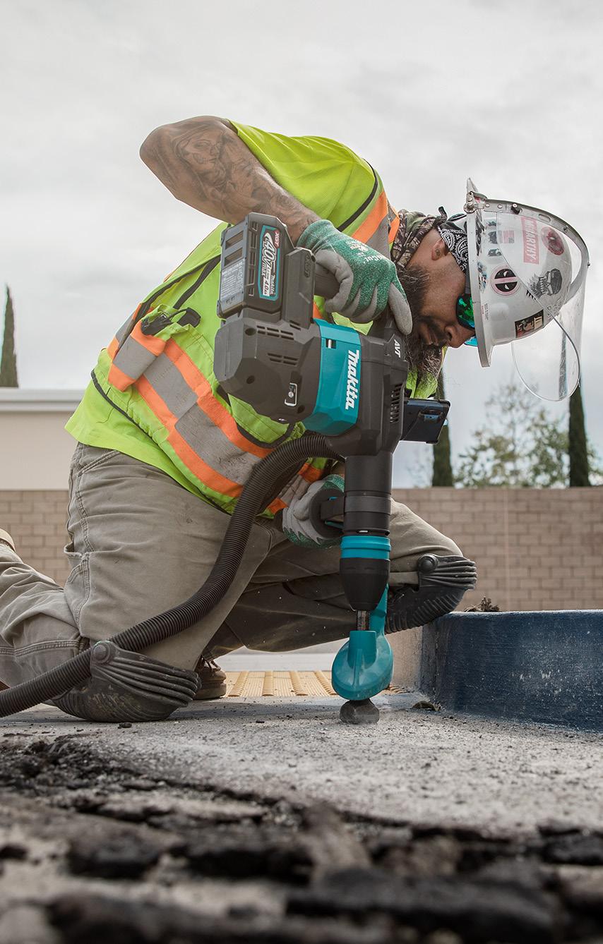Tough on concrete, not on you. Makita’s hard-hitting Fully Cordless 80Vmax XGT® Demolition Breaker Hammer is equipped with Anti-Vibration Technology (AVT), an exclusive counterbalance system that reduces vibration. The result is more efficient hitting on the concrete and less vibration in the tool. The 80Vmax XGT® Demolition Breaker Hammer HM004GZ01 is engineered to be the most efficient breaker hammer In its class with a 4,400W total power output with a powerful and efficient Makita built Brushless Motor that provides 870 BPM and boasts a staggering corded and petrol powered equivalent 72.8 joules of impact energy with less vibration. Featuring AWS®, HM004GZ01 can be connected to any Makita AWS® compatible dust extractor for seamless AutoStart Bluetooth connectivity of the Tool and Vacuum using the included AWS Chip and optional Dust Extractor attachment. Other features include a maintenance warning function, that warns the user when a tool needs maintenance like machine grease, dual LED lights with pre and afterglow functions, XPT (Extreme Protection Technology), protecting internal components from dust and water ingress, ensuring durability and longer life to withstand the harshest commercial job site conditions. HM004GZ01 accepts commonly used 28.6mm Hex Shank Demolition breaker bits and is the ideal breaker hammer for landscapers, pool installers, electricians, plumbers, masons, remodels, and general contractors seeking a best-in-class industrial quality, fully cordless breaker hammer.