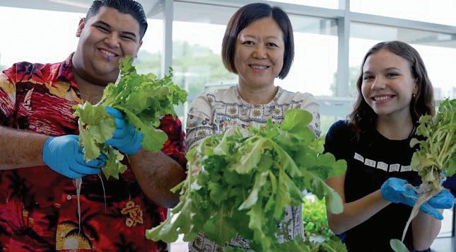 Dr. Mu and research assistants collect a harvest from the hydroponics lab