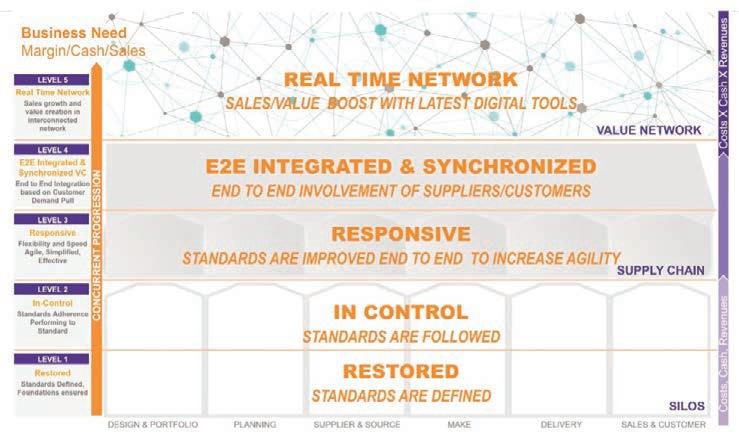 holistically across all the E2E Value Chain domains to ensure they are improved upon in a on current manner against business and market aligned goals. By synchronising capabilities and performance improvement across these domains, key interdependencies are identified and work in parallel. This allows quicker progression and sustained gains. The CDVC Model first translates business goals by domain performance requirements, then assesses current state capabilities versus those requirements. An improvement plan is then plotted to span the CDVC Domains.