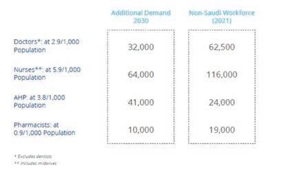 The demand will be even higher as a part of the Saudisation drive in the healthcare sector as the majority of these jobs must be filled by Saudi nationals. Presently, 63 per cent of doctors, 47 per cent of dentists, 57 per cent of nurses, 18 per cent of AHPs and 61 per cent of pharmacists, a total of around 223,000 medical professionals, are expatriates.