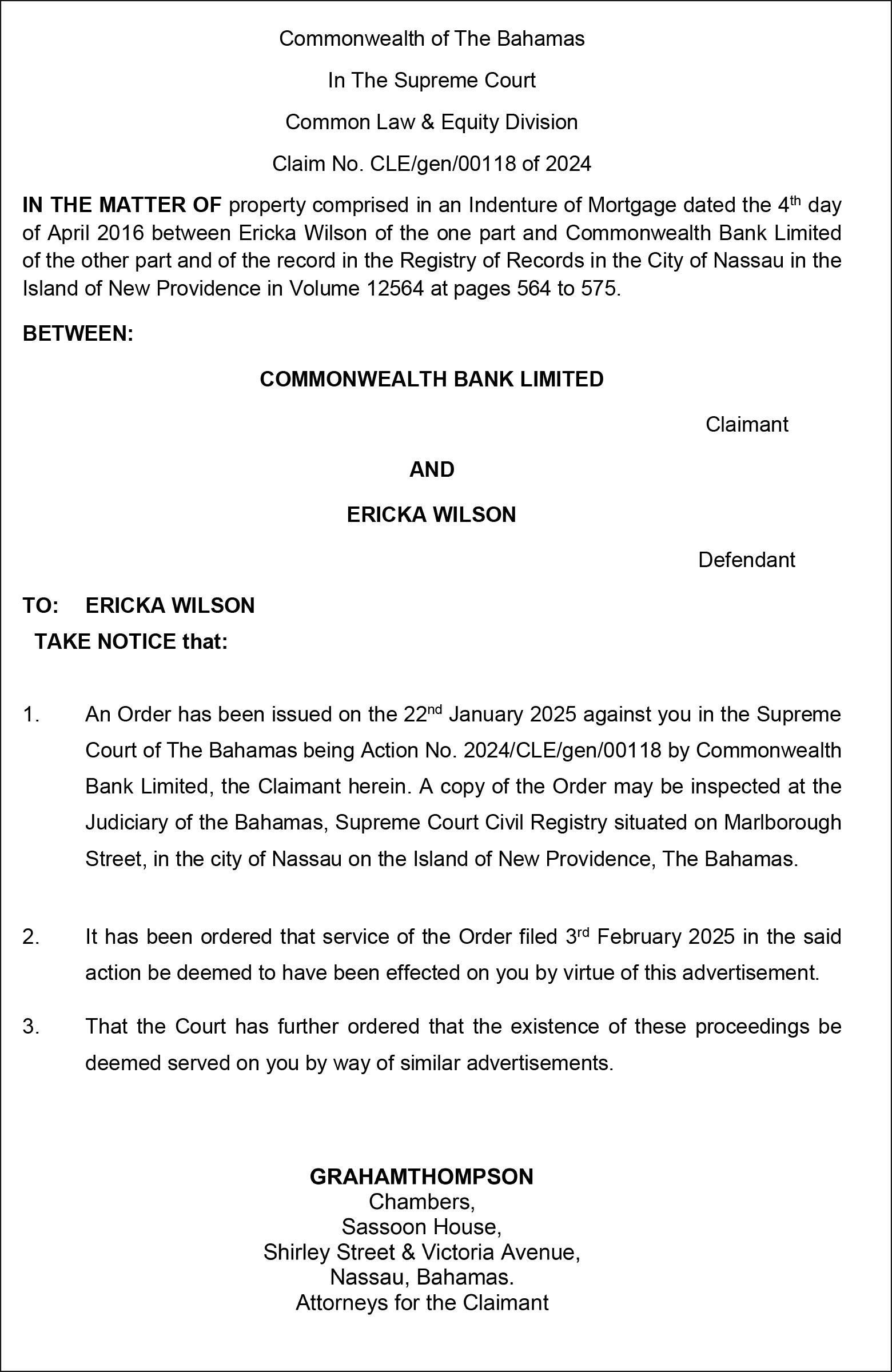 NOTICE is hereby given that MARIA DEL ROSARIO RAMOS GUTIERREZ of #10 Edmond Street, New Providence, The Bahamas, applying to the Minister responsible for Nationality and Citizenship, for Registration Naturalization as a citizen of The Bahamas, and that any person who knows any reason why registration/naturalization should not be granted, should send a written and signed statement of the facts within twenty-eight days from the 12th day of February, 2025 to the Minister responsible for nationality and Citizenship, P.O. Box N-7147, Nassau, New Providence, The Bahamas.