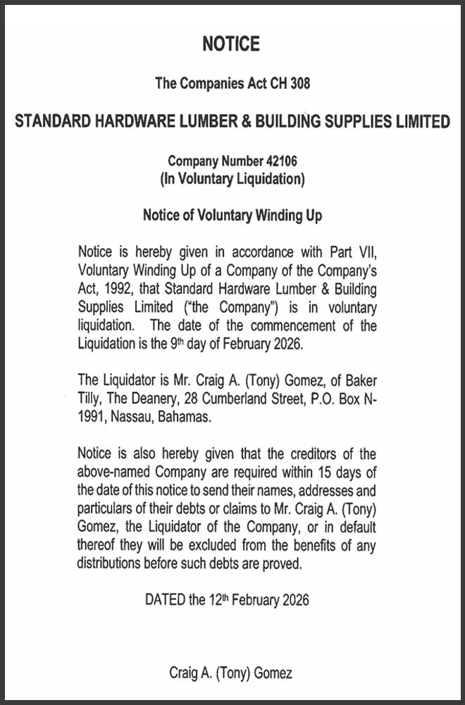 NOTICE is hereby given that ANTHONY MEME of Brown’s Alley off Kemp Road, New Providence, Bahamas is applying to the Minister responsible for Nationality and Citizenship, for registration/ naturalization as a citizen of The Bahamas, and that any person who knows any reason why registration/ naturalization should not be granted, should send a written and signed statement of the facts within twenty-eight days from the 16th day of February, 2026 to the Minister responsible for nationality and Citizenship, P.O. Box N-7147, Nassau, Bahamas.