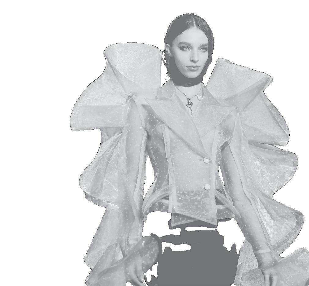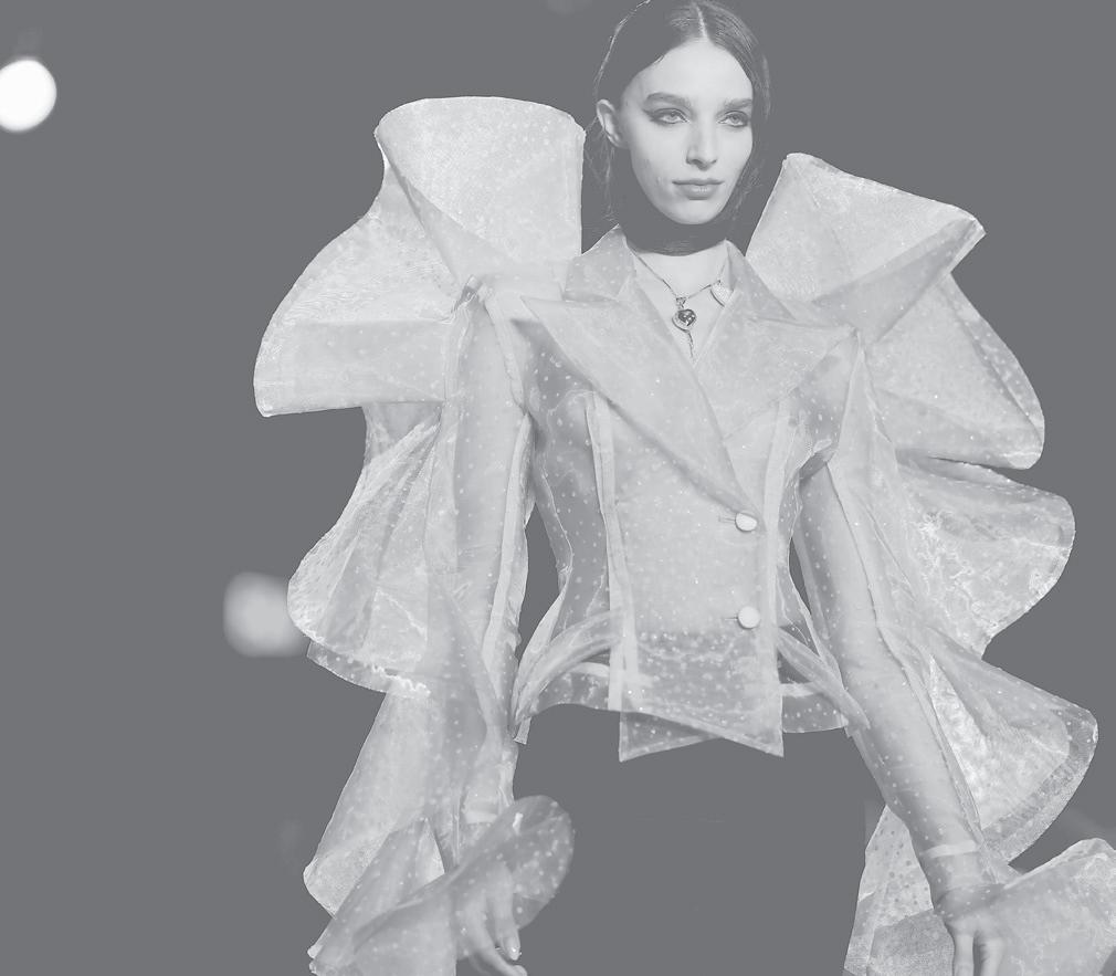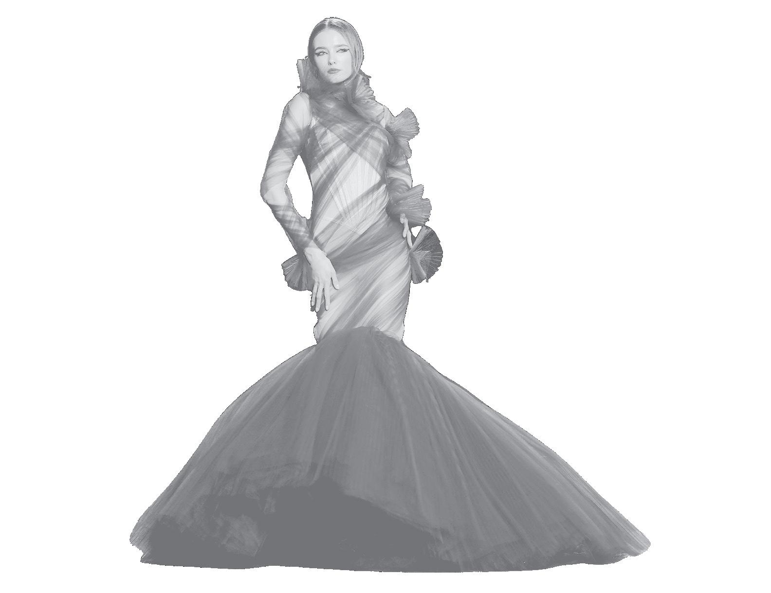 sleeves or peplums. Even his black and white designs, featured shimmering fringe, alluring cut outs, feathers or delicate beading.