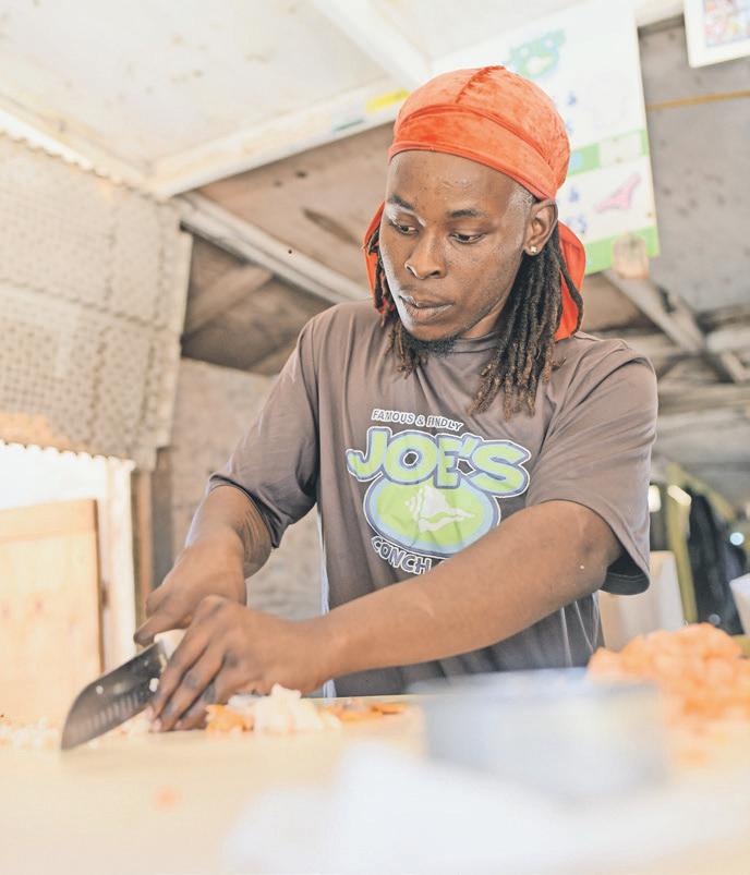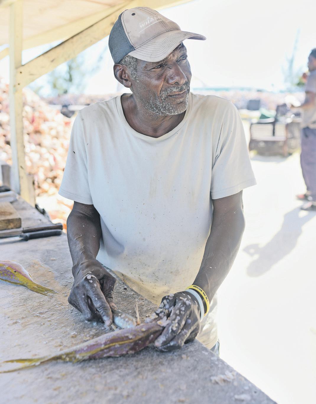 Big Derek stands near the water’s edge, knife moving with practised precision, as he cleans freshly caught fsh. Conch shells pile nearby — harvested that morning, destined for salad by lunchtime. The salt air carries the scent of the sea and citrus.