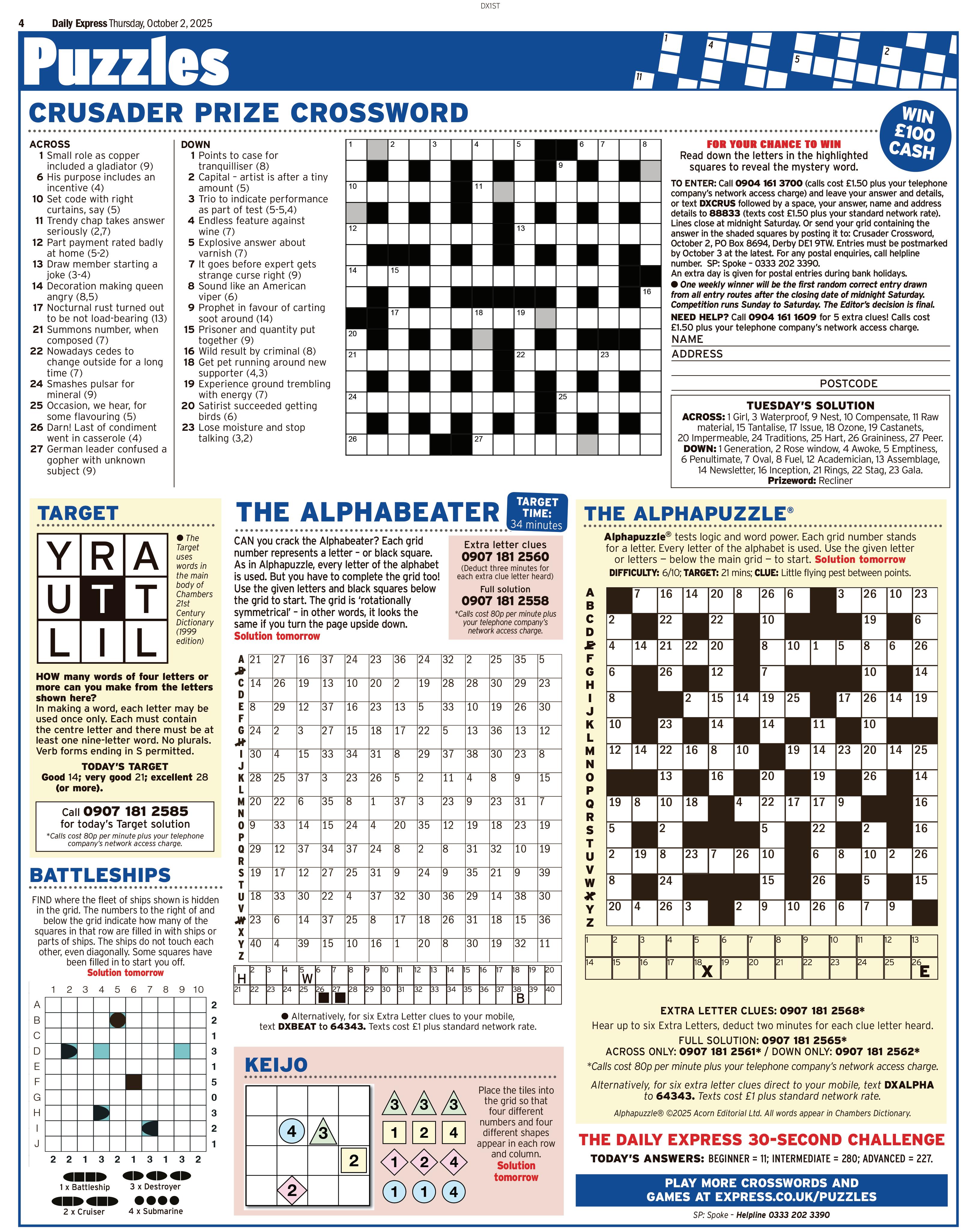 One letter stands for another. In this example, A is used for the three L’s, X for the 2 O’s, etc. Single letters, apostrophes, the length and formation of words are all hints. Each day the code letters are different.