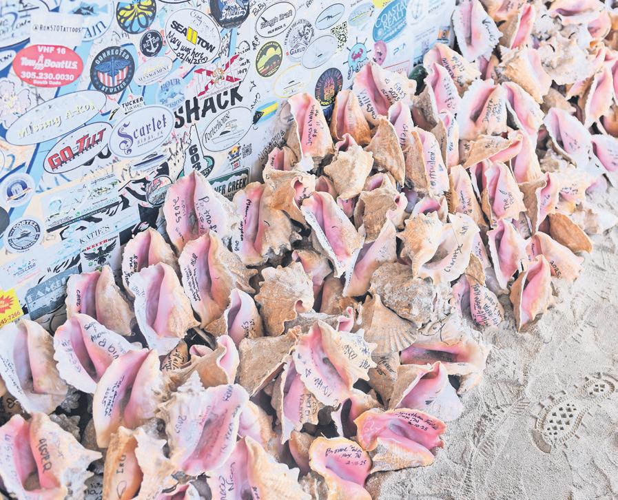 And then there are the signatures. At local bars and waterfront hotspots, benches are etched with names of visitors who promised to return. Frames are flled with vacation snapshots. Dollar bills, signed and dated, paper the walls — small monuments to memories made in salt air.