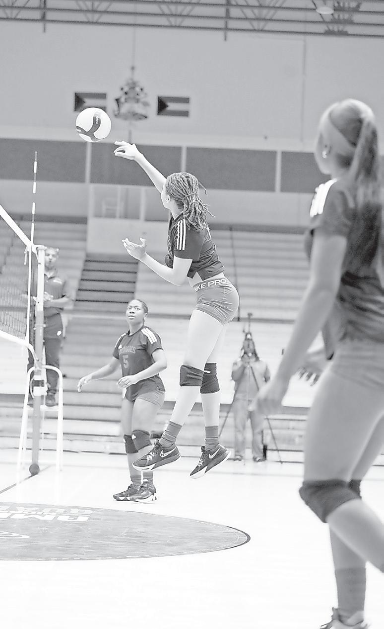 UB Mingoes right hitter Miracle Stubbs goes up for a spike.