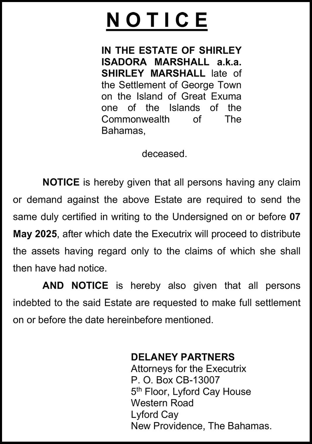 Notice is hereby given that the above-named Company is in dissolution, commencing on 1st April, 2025. Articles of Dissolution have been duly registered by the Registrar. The Liquidator is Lynden D. Maycock, Victoria House, Suite No. 4, 5th Terrace Centerville, P. O. Box EE-15953, Nassau, Bahamas.