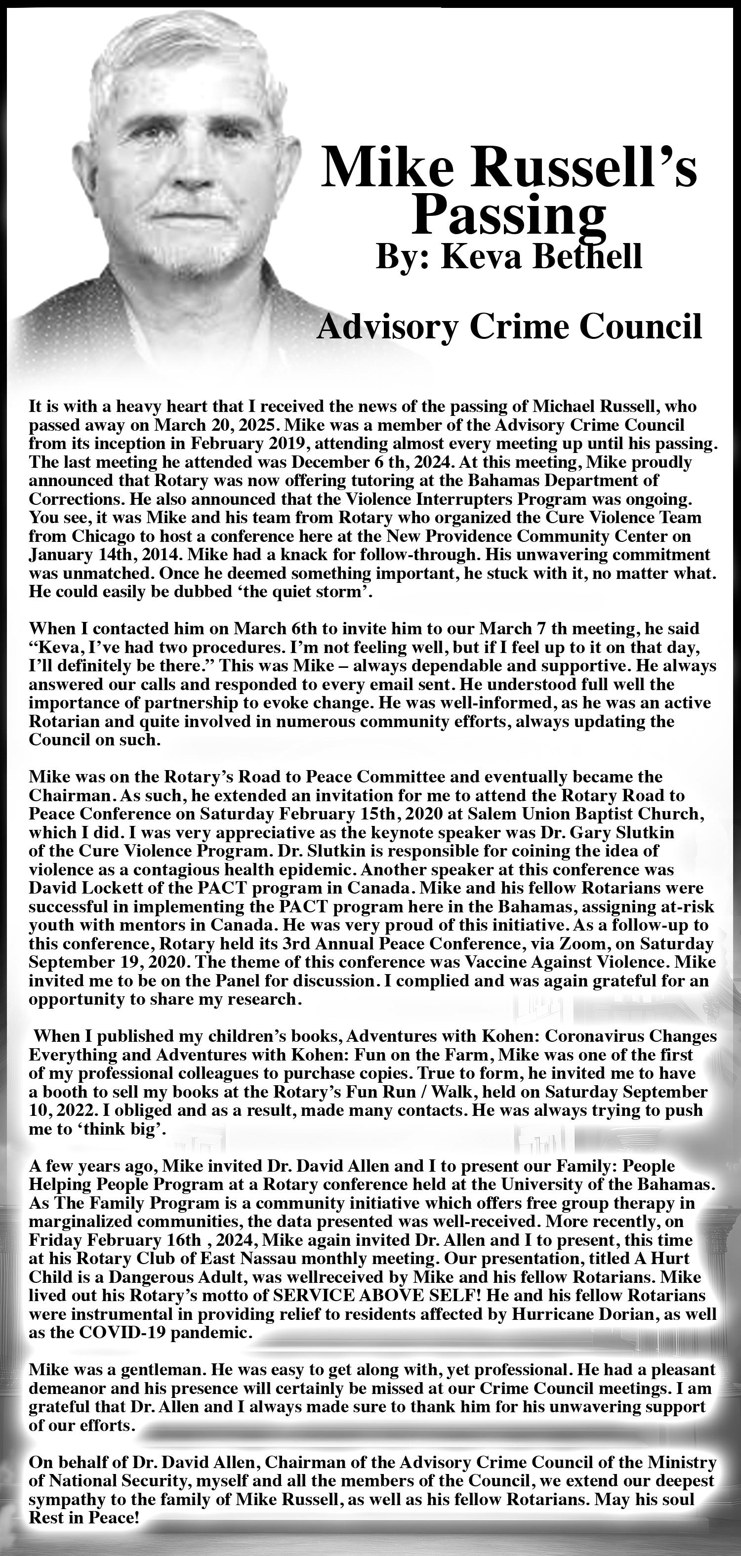 (Theresa) Moss, Sr.; Michael (Simone & M.J.) Adderley; Ms. Michelle Miller, Mrs. Cindy Wade, Minister Ricardo (Akera) Stubbs, Justice Rhonda Bain and family, Dr. Brian (Linda) Tynes, Byron (Dr. Sharmane) Miller; Edison and Darleen Sumner; Rodney (Carol) Collie, Derek Adams, Jr., Anthony and Wanda McPhee; Olive Patton; Francelia Outten and family; Pamela Rolle-Storr and family; Bahamas Harvest Church Intercessory Prayer Team, Management and staff of Jamboree Kids Swim Camp, Management and staff of Rubis Service Station, Management and staff of Teachers & Salaried Workers’ Cooperative Credit Union, Ltd., patrons of Blest Place Barber Shop, the communities of Rolleville, Stuart Manor, Curtis and Alexander, Exuma, and the entire Bimini community.