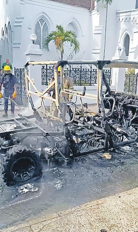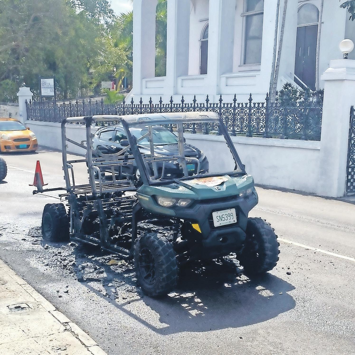FIREFIGHTERS battled a vehicle fire yesterday on Duke Street near St Andrew’s Presbyterian Kirk and Central Bank of The Bahamas involving seven tourists from South Carolina, including a young child. The company responsible for the UTV rental is Cruise Bahamas ATV Rentals. The owner declined to comment, expressing concern for the tourists. The incident occurred at about 9.50am yesterday, with no reported injuries. “Upon arrival, fire personnel meet an ATV buggy, it was fully engulfed in flames,” said Inspector Cendeno Hepburn, of