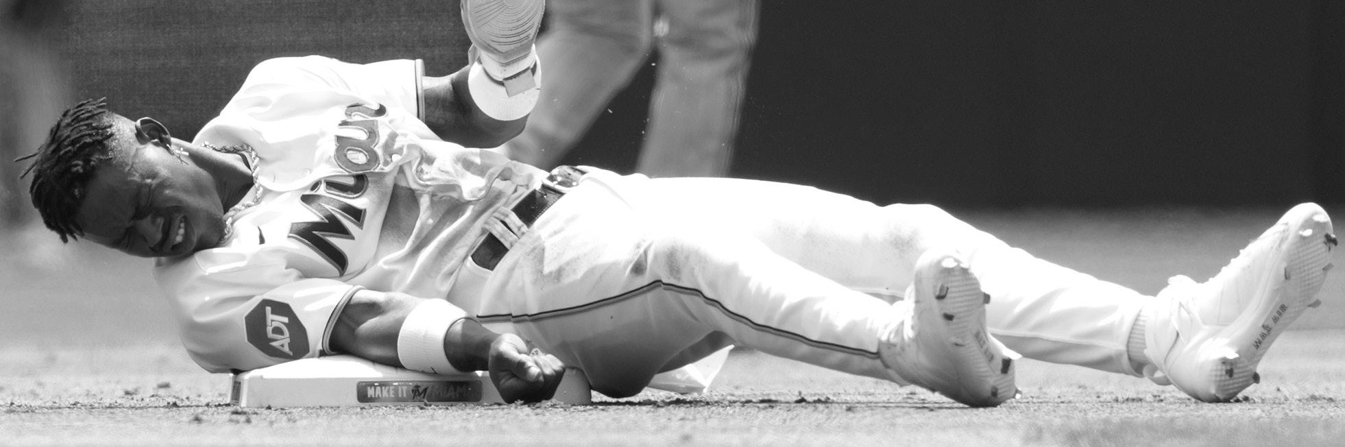 MIAMI Marlins centre fielder Jazz Chisholm Jr. reacts as he is injured attempting to steal second during the first inning against the Minnesota Twins yesterday in Miami.