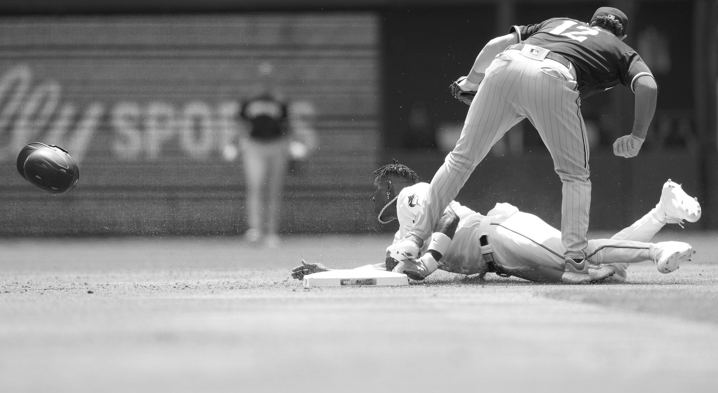 MIAMI Marlins’ Jazz Chisholm Jr. is out attempting to steal second base as he collides with Minnesota Twins second baseman Kyle Farmer during the first inning of a baseball game, Wednesday, April 5, 2023, in Miami.