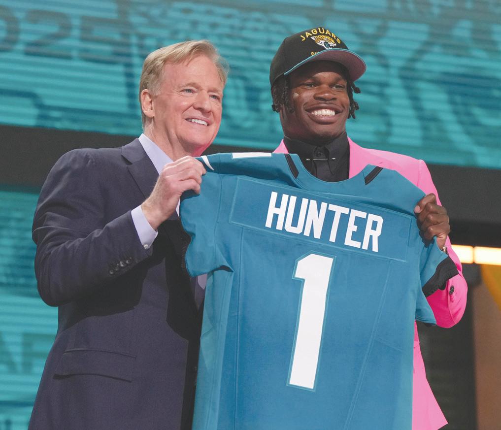 Hunter wore a neon pink blazer and flashed a big smile after the Jaguars selected him. He caught 96 passes for 1,258 yards and 15 touchdowns while making 35 tackles, breaking up 11 passes and picking off four.