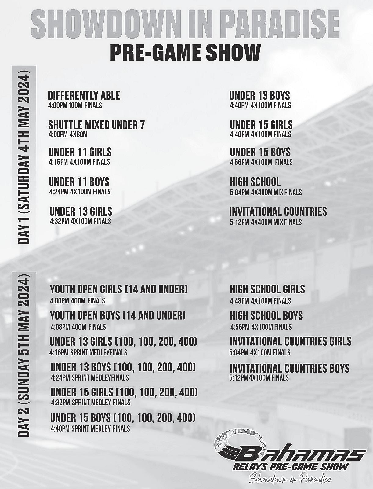 “Showdown in Paradise” will commence with the Differently Able 100m finals at 4pm on Saturday.