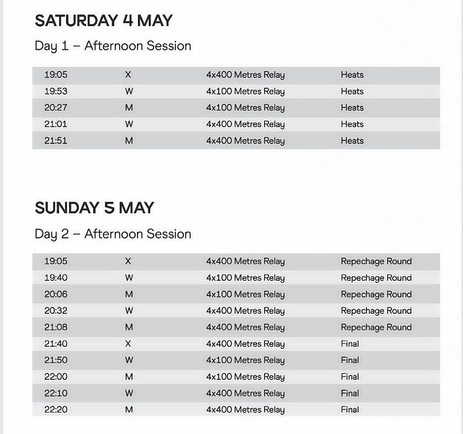 is set to feature athletes from under-7 to the under15 in the 4x80m shuttle relays. Athletes ranging from under-11 to under-15 will compete in the 4x100m and 4x400m relay events. The invitational countries will be in action in the 4x100m event and 4x400m mixed relays.