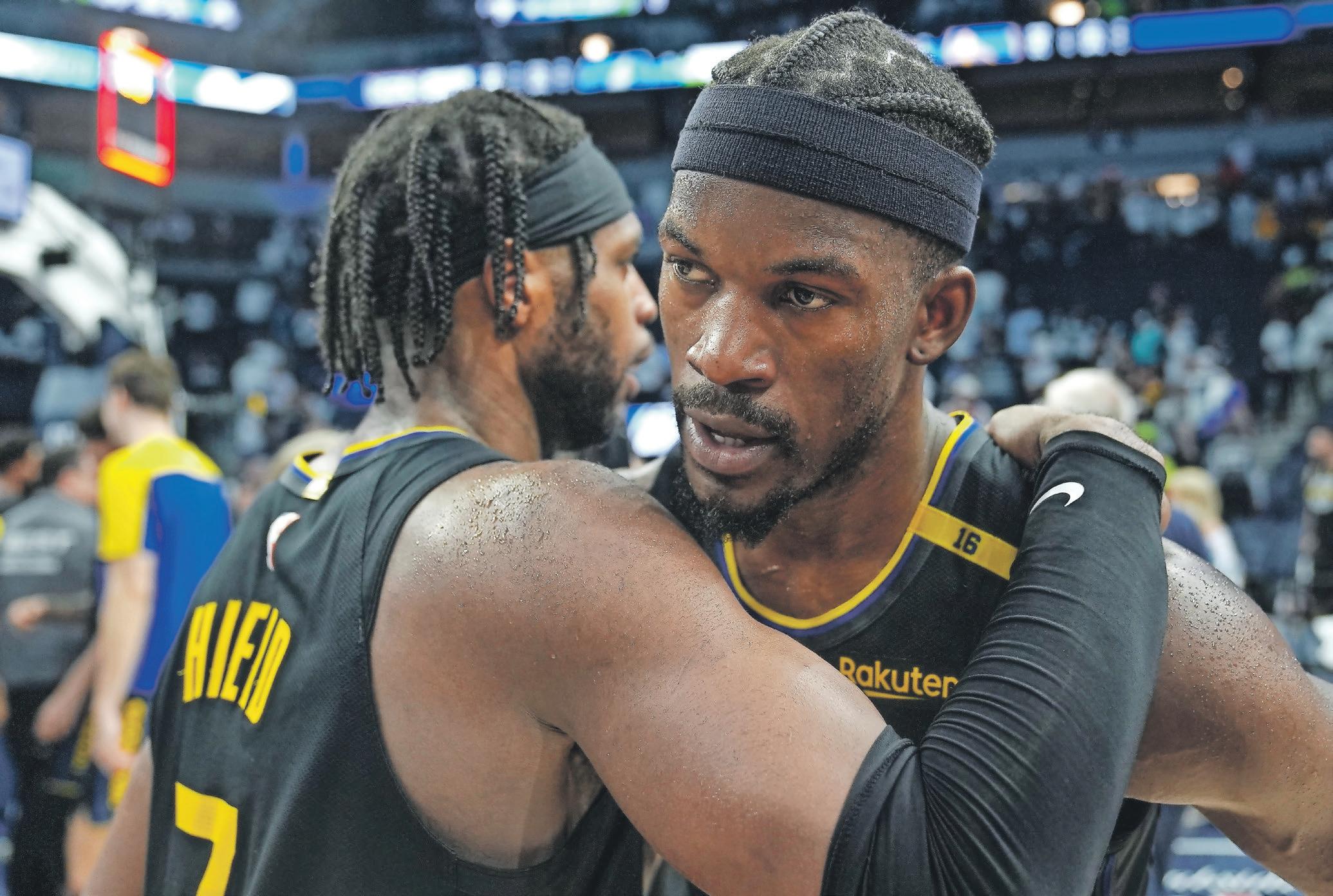 GOLDEN State Warriors guard Buddy Hield (7), left, and forward Jimmy Butler (10) hug after Game 1 of an NBA basketball secondround playoff series against the Minnesota Timberwolves on Tuesday in Minneapolis. (AP Photo/Abbie Parr)
