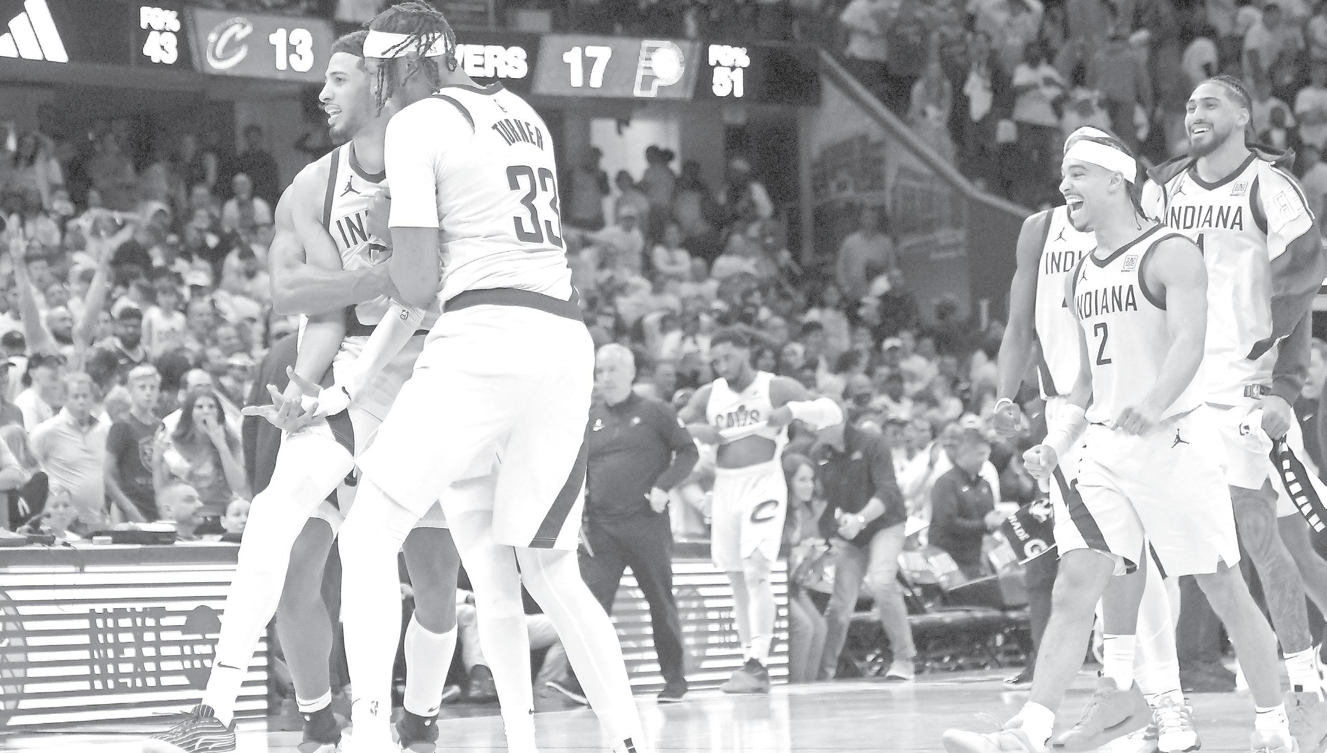 FROM left, Indiana Pacers Tyrese Haliburton, Myles Turner, Andrew Nembhard (2) and Obi Toppin, right, celebrate after defeating the Cleveland Cavaliers in Game 2 in the Eastern Conference semifinals of the NBA basketball playoffs on Tuesday night in Cleveland.