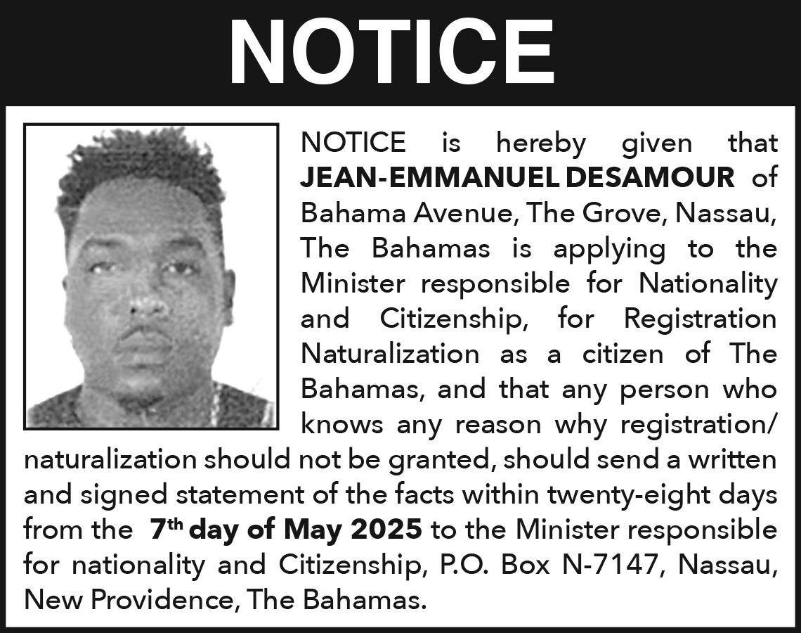 NOTICE is hereby given that KARL HEINZ BRACKHAUS of P.O. Box N7776 High Meadows, Lyford Cay, Nassau, The Bahamas is applying to the Minister responsible for Nationality and Citizenship, for Registration Naturalization as a citizen of The Bahamas, and that any person who knows any reason why registration/naturalization should not be granted, should send a written and signed statement of the facts within twenty-eight days from the 7th day of May 2025 to the Minister responsible for nationality and Citizenship, P.O. Box N-7147, Nassau, New Providence, The Bahamas.