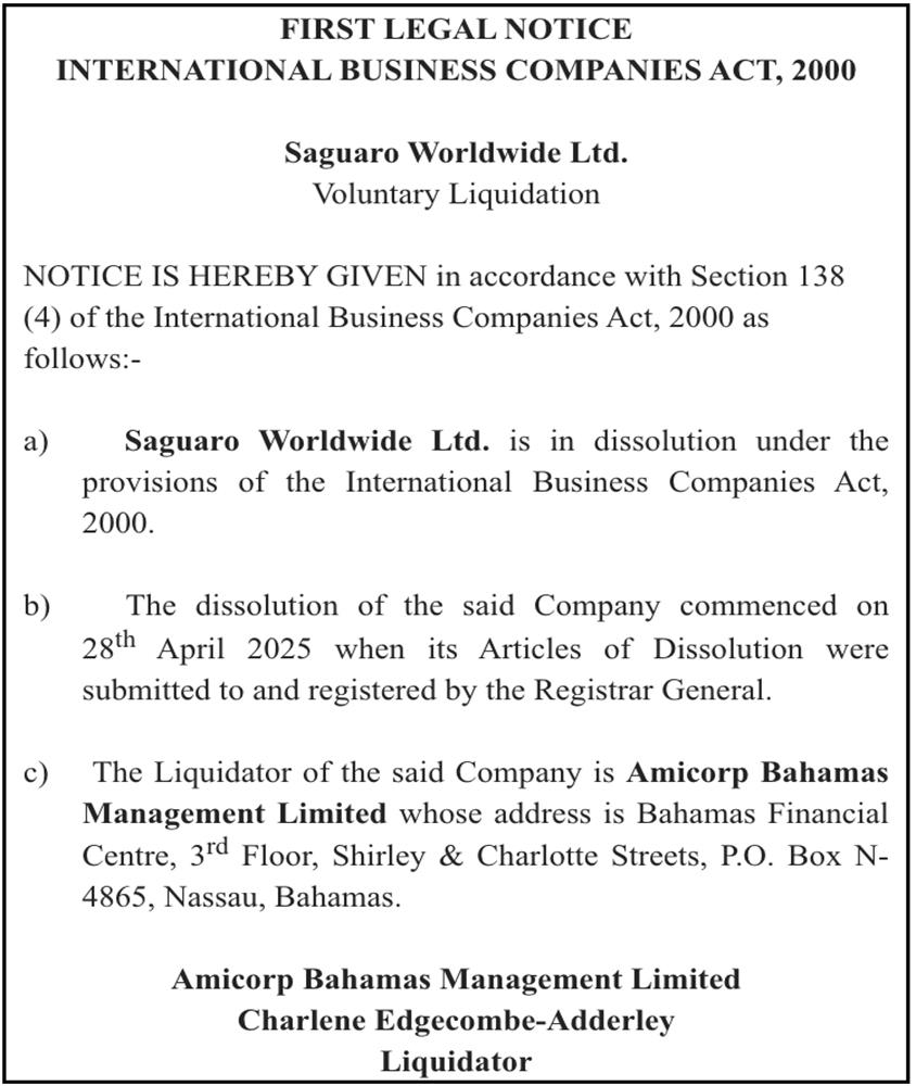 Notice is hereby given that the liquidation and the winding up of the Company is complete and the Company has been struck off the Register of Companies maintained by the Registrar General. Dated this 13th day of May A.D. 2025.