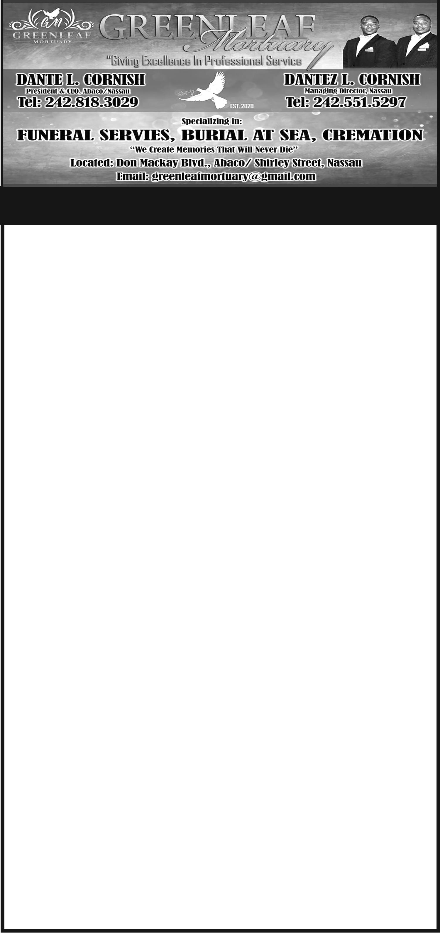 She is survived by her children: Philip, Fredrick and Jermaine Bowleg; Patricia Meadows and Carla Cooper; sonsin-law: Pastor Keith Meadows and Minister Moses Cooper; daughtersin-law: Teresa Bowleg and Brittany Bowleg; adopted daughter: Kathy Legerme; grandchildren: Philip and Andrea Bowleg, Keith Jr., (Nadia) and Keitron Meadows, Frederick II and Diana Bowleg-Swan, Carniqua and Chrystano Cooper, Jaiden, Jermaine Jr., Brinae, Brycen, Elijah Bowleg and Jamari Culmer; great grandchildren: Bryce Mathis, Kyshawn, Kenaz and Keithra Meadows, Nyaa Bowleg-Swan, Tyra and Charles Rolle; brothers: Carl Swann Sr. and Audley Swann; sister-inlaw: Renee Swann; nieces: Christina Bethel, Tamica Saunders, Tihanna and Ta’Layah Davis, Nareca Swann, Orminickah Swann, Denicker Manuel, Oryanna Smith, Zaynah Harvey; nephews: Bryan Sr., Bryan Jr. and Christon Bethel, Carl L. and Carl D. Swann, Ricardo Knowles, Randico Swann, Devon Laing, Amon Kerseymere, Ormand and Orminick Swann, Zayvri Harvey, Dirk Guerrier; caretakers: Nadine Ricketts, Betty Calixte, Althea Stuart, and Retunzol Johnson; and a host of other relatives and special friends including: Vanessa Williams, Elizabeth Hopkins, Anette Bowleg, Bishop Bradford Dean and family, Pastor Freddie Laing and family, Pastor Napathli Cooper and The Lord’s House family, Rev. Finton Russell and family, Pastor Patterson Williams and family, Pastor Tyrone Thomas and family, Pastor Keith Mullings and family, Dr. Anthony Williamson and family, Hon. JoBeth Coleby–Davis and Family, Hon. Patricia Deveaux and The Bamboo Town Constituency Family, Hubert Saunders and family, Othneil Robinson, Shirley Williams and Family, Martha Ferguson-Henry and family, David Wallace and family, Rowena Cooper and family, Rochelle Minnis and the Eight Mile Rock Social Service Department, Queenie Gibson and family, Deputy Commissioner Leamond Deleveaux and family, Lovern Wildgoose and family, Dianna Swann and family, Troy internet guy, Southwest Electric family, the Tinker, Silver, Mullings, Daxon, Baker, Powell, Bonaby, Moss, and Walkins families, Freeport Gospel Chapel School family, Judah House Of Praise Ministries, National Insurance Board, Subway, Jermaine Bowleg Painting and
