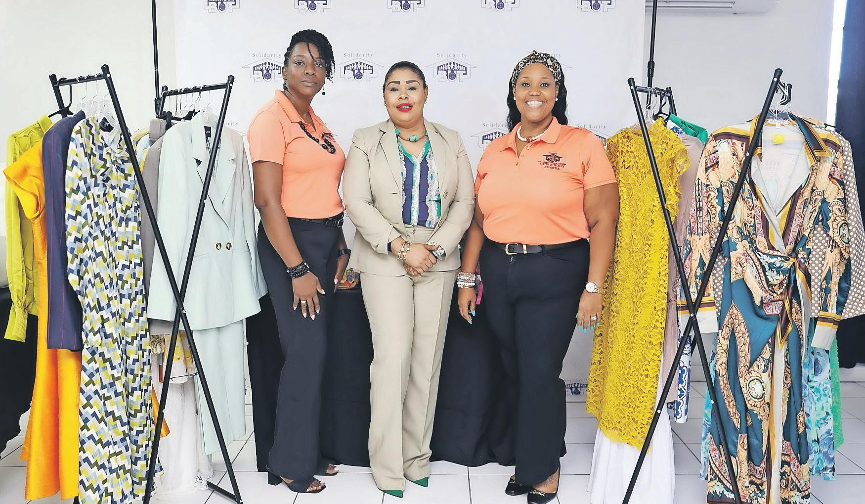 Above: Khandi Gibson of FOAM assists in the presentation of clothes donation. below: Belinda Wilson, president of the Bahamas Union of Teachers speakers to reporters about the clothes drive to provide women with professional attire for their jobs.