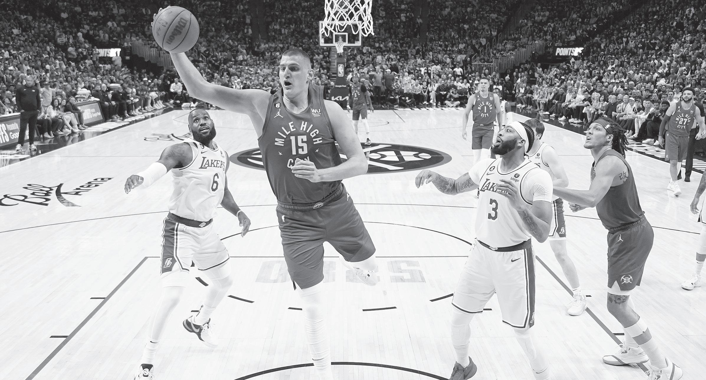 NUGGETS centre Nikola Jokic (15) pulls down a rebound as Lakers forward Anthony Davis (3) and LeBron James look on during the first half of Game 1 of their NBA basketball Western Conference Finals series last night. (AP Photo/Jack Dempsey)