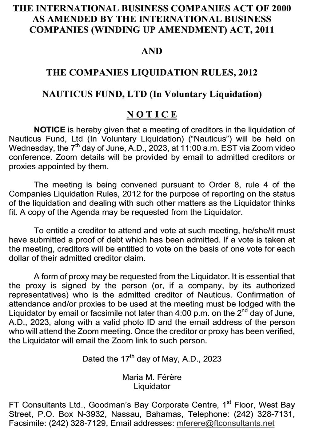 (c) The Liquidator of the said company is Bukit Merah Limited, The Bahamas Financial Centre, Shirley & Charlotte Streets, P.O. Box N-3023, Nassau, Bahamas