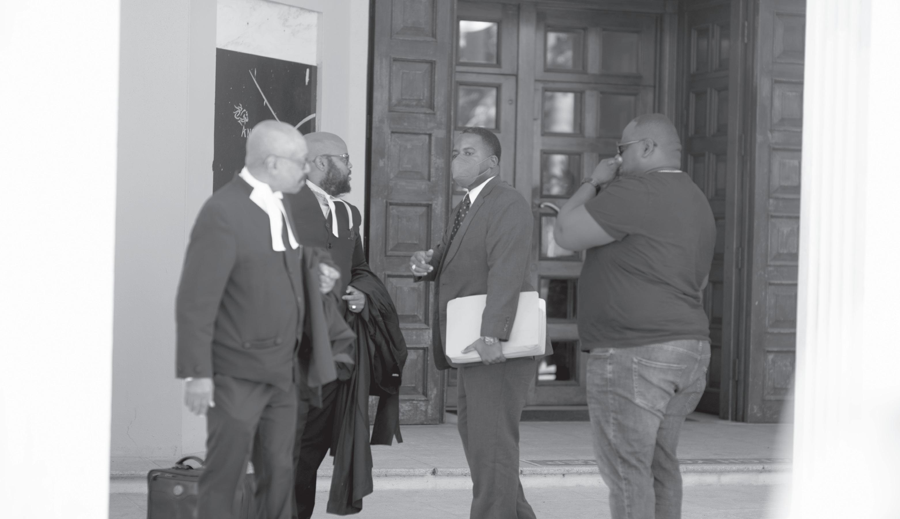 Long Island MP Adrian Gibson (centre) speaks with his lawyer Murrio Ducille (left) outside court on Monday.