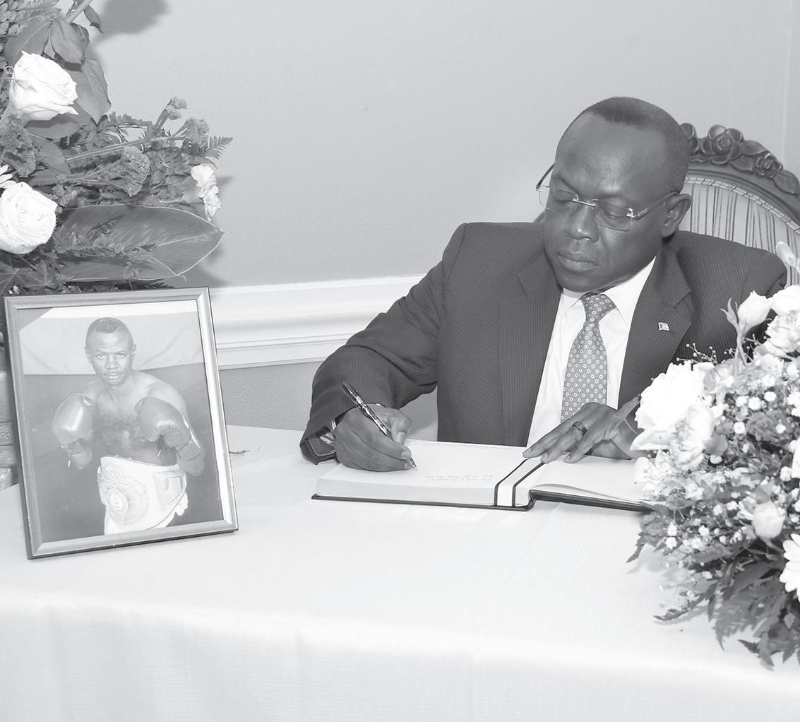 DEPuTy Prime Minister and Minister of Tourism, Investments and Aviation the Hon. Chester Cooper signed the Book of Condolence and paid respects to the family of the Late Lorenzo Anthony ‘Ray’ Minus, Jr., Retired Iconic Boxer, at Restview
