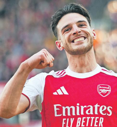 ARSENAL’s Declan Rice celebrates after scoring his side’s opening goal during the English Premier League soccer match against Newcastle United at Emirates stadium in London yesterday. (AP Photo/Kirsty Wigglesworth)