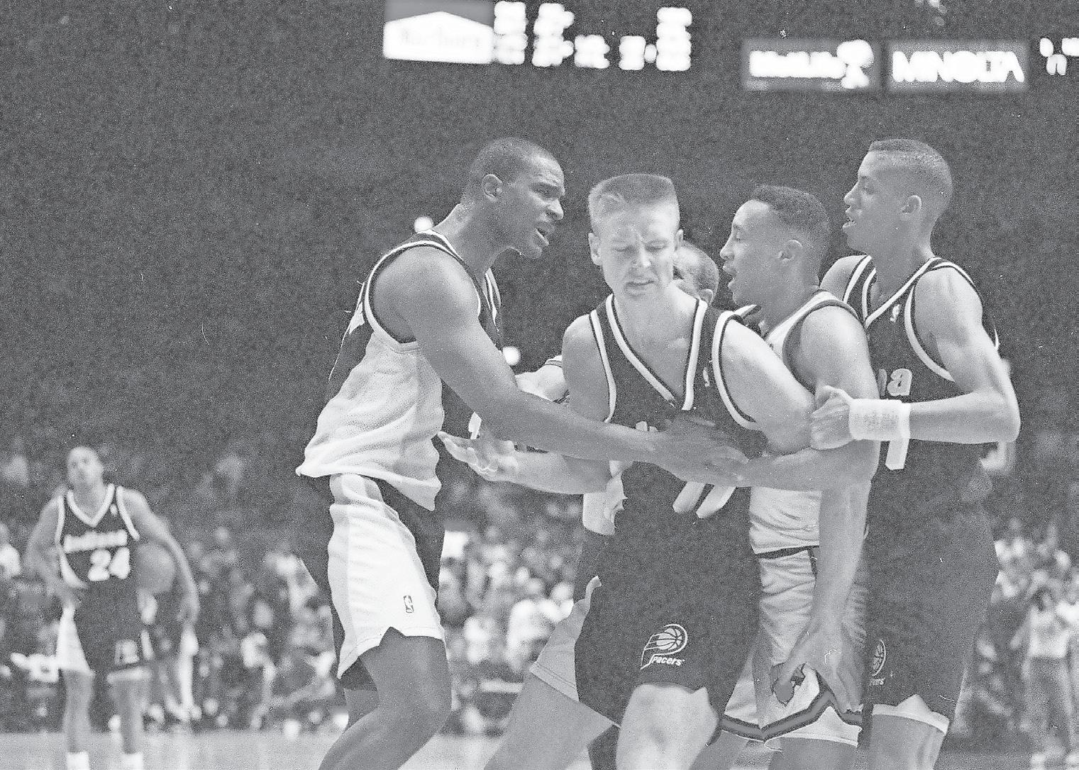 with fouling him and became frustrated. As they ran downcourt face-to-face exchanging words, Starks leaned in and headbutted Miller. Starks was ejected and the Pacers went on to win the game. Choke!