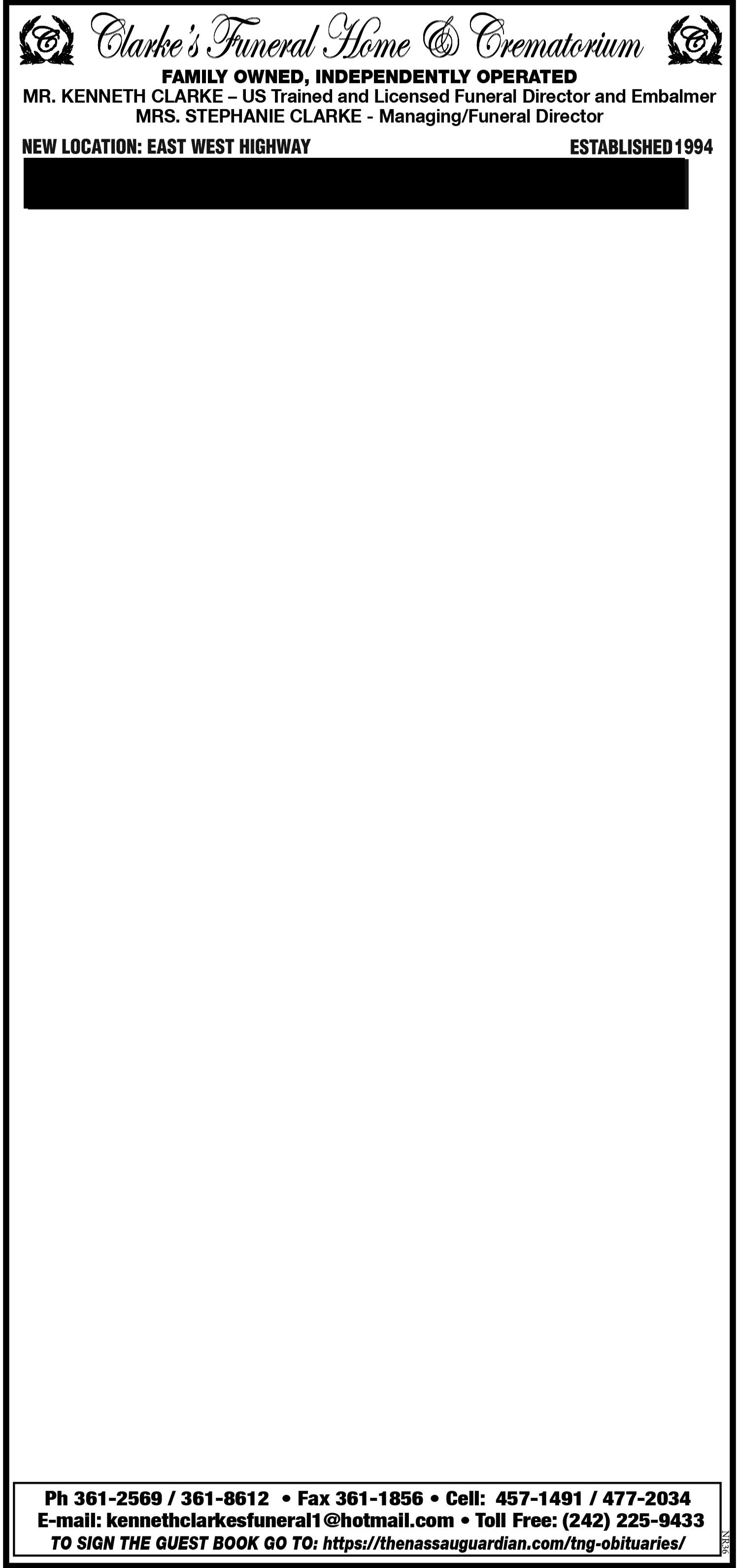 He is survived by his children: Anthony Clarke, Linda Sands-Crowley & William Crowley (California) Christopher Clarke (Monique); grandchildren: Demond Clarke, Tiffany & Leeky Eugene (Canada) Valentino & Jenna Sands (Michigan), Treco Clarke, Lavardo, Jason & Christopher Miller, Tonya & Kayno Clarke, Anthony Clarke Jr., Shanthonique Smith, Shantell, Anthonique & Antoine Clarke, Anita Rolle, Keishell & Keishawn Hall, McKell Thompson, Kaleel Gibson, Christanique and Christen Clarke; nieces and nephews: Sarah D Frith-Deane & Michael Deane (New York) Joseph, Christopher & Richard Horton, Eldridge & Insa Frith, Tweed Dean, Tyrise Sawyer, Willimae Goodman, Basil & Peter Tynes, Allison, Jerome & Anita Knowles; sister-in-law: Edith Sawyer; and a host of relatives and friends too numerous to mention.