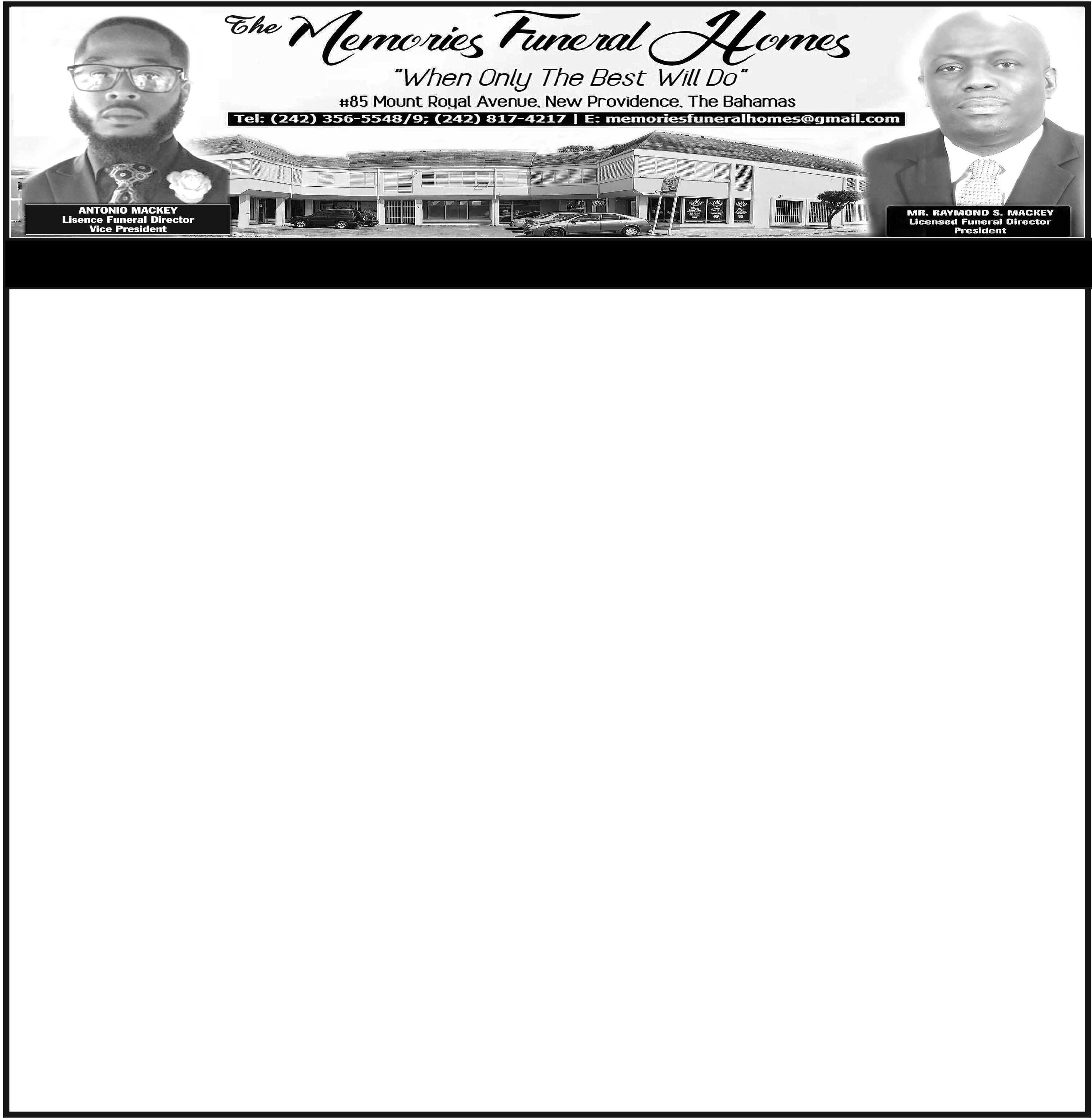 Left to celebrate and cherish her life, Husband: Cyril Strachan; Children: Benny Taylor, Carmel Taylor Rhodes, Valentino Taylor, Cyrynda Strachan (Adriel Albury); Adopted Children: Charonya Strachan, Cyleste Stubbs, Sean St Louis, Kids of the Nazereth Centre; Parents: Rosemary and Joel Mackey; Brothers: Arnold Gilbert, Jango Gaitor; Sisters: Minister Sherria Stubbs, Minster Patricia Johnson-Pratt, Lynette Taylor; Grand children: Andre and Ashante Taylor, Azriel Albury, Tijay Taylor; Motherin-law: Ms. Ruth Strachan; Son-in-law: Randal Rhodes; Daughter-inlaw: Bonnie McKinney, Tomonique Butterfield; Brother-in-law: Sygmon Stubbs, Brusal Pratt; Sister-in-law: Tonya Gaitor, Mariza Gilbert, Branhilda Bostwick, Martha Brown, and Sharmaine Strachan; Uncles: William and Samuel Lindsay (Arlene); Aunts: Marva Lindsay, Betty Taylor; Nephews: Jarrett Johnson, Ian Lightbourne Sr. (Charlotte), Kevin Michael Burrows (Shakira), Shamon Stubbs Sr., Gentry Kellman Jr., Jerome Gaitor, Marvin Pratt Jr., Kai Gaitor, Monty. Nieces: Vanencha Gilbert, Simone Stubbs, Destiny Pratt, Kali Gaitor. Grand Nephews: Shamon Jr. and Shaw Stubbs, Ian Lightbourne Jr.; Grand Nieces: Faith Stubbs, Imani Lightbourne; Godchildren: Shantoria Stubbs and Quency Edgecombe; Cousins: Phillp, Steve, Bill, Perry, Dave, Nikita, David, Kampy, Greg, Spartacus and Perez Lindsay, Garvin Grant, Nathaniel Darling, Delvin and Shelby Scott, Brenda Ward, Melvern Ross, Maxine Darling, Margaret, Deidree, Alexandria, Felicia, Tasha, Tamara, Rosenell, Dora, Kayla, Tia, Georgette and Mary Anne Lindsay, Evette Darling, Vanessa Smith, Mary Whylly, Precious Scott, Patricia Pennerman, Michael Rolle. Including numerous other relatives and friends, Dominique Humes, Stuart Yustare, Nicole Octelus, Illanette Telus, Louise Adderley, Kesha, Marcus, Sinclair Dean, Katie, Sally, Nicole Whitfield, Latesha Stubbs, Katrinka Butler, Amanda Thompson, David Tinto, Turkessa Morley, Bianca Moss, Betty Farrington, Deborah Kelly, Erica Fritz, Angela Carey, Shirley Carey, Evangeline Lockhart, Augusta Cash, Muriel Sands, Judy Ferguson, Caroline Forbes, Hilda Ferguson, and Violet Smith, Wilmore, Hepburn, Fanny, Raquel, Mildred Duncombe and family, Bargain City Shopping Plaza (Roker’s Service Station), Peter & Caretta Roker, Margaret Dean, The Red Cross (Ms. Dormeus), Sunrise Snacks and Convenience Family, Garvin Tynes Primary School, Tonya Benjamin, Jacqueline Gray, Keron