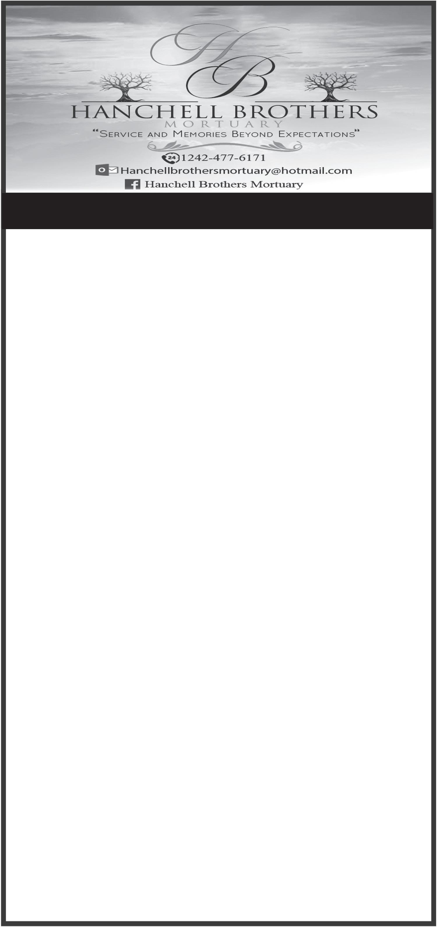 Left to cherish his fond memories are his sons: John (Dion) Alfred Wright Jr. and Kipkeino Wright; daughter: Joneka A. Wright; son-in-law: Ralph Godet; daughterin-law: Gahnise Wright; grandchildren: Breon Saunders, Dion, Jade, D’Angelo, Tavia, Carter, Andrick, Rashard, Keyanna, Khari Wright, Renajah & Reneyah Lewis; great grandchild: Drake and Andrick Wright Jr.; sisters: Barbara Wright, Eleanor Heild, Gail Johnson (Chester), Deann Arnett (Keith) & Mildred Curry; brothers: Retired Commissioner of Corrections Patrick (Rhonda) Wright, Godfrey (Lydia) Wright, Kendall (Tanya) Wright & Craig Wright; sister-in-law: Rocelia (Glen deceased) Wright; aunt: Magnola Bethel, Freeport,Grand Bahama; numerous nieces and nephews including: Drameco (Sheneque) Glinton, Sean Wright, Godfrey WrighJr., Chester (Anshanique) Johnson Jr., Brent Curry Jr., Sheneque (Damian) Tinker, Janille and Ashley T. Wright, Tamara Hield; cousins: Vernal Sands, Dorothy Cox and Ernastine Bullard; friends & their families but not limited to: Rosemary Burton, Vincella Lloyd, Willis Evans Jr., Willard (Ingrid) Clarke, Angria Woodley, Pastor Donn Carlos Knowles and the Members of Believers Embassy International, St. Barnabas Usher Board and Auxiliary Garden Club, Taxi Cab Dock and Cable Beach, the staff of Environmental Health Services, Atlantis VIP Services Airport Kiosk and The Winterbotham Trust Company Limited, Rev’d Fr. Rodrick Bain, Rev’d Fr. Chester Burton, Caregiver Ms. Manny, Ursula Rodgers, Ms. M. Antoinette Russell and many others too numerous to mention.