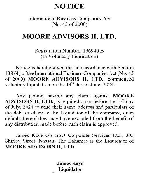 The dissolution of the said Company commenced on June 12, 2024 when the Articles of Dissolution were submitted to and registered with the Registrar General in Nassau, The Bahamas.