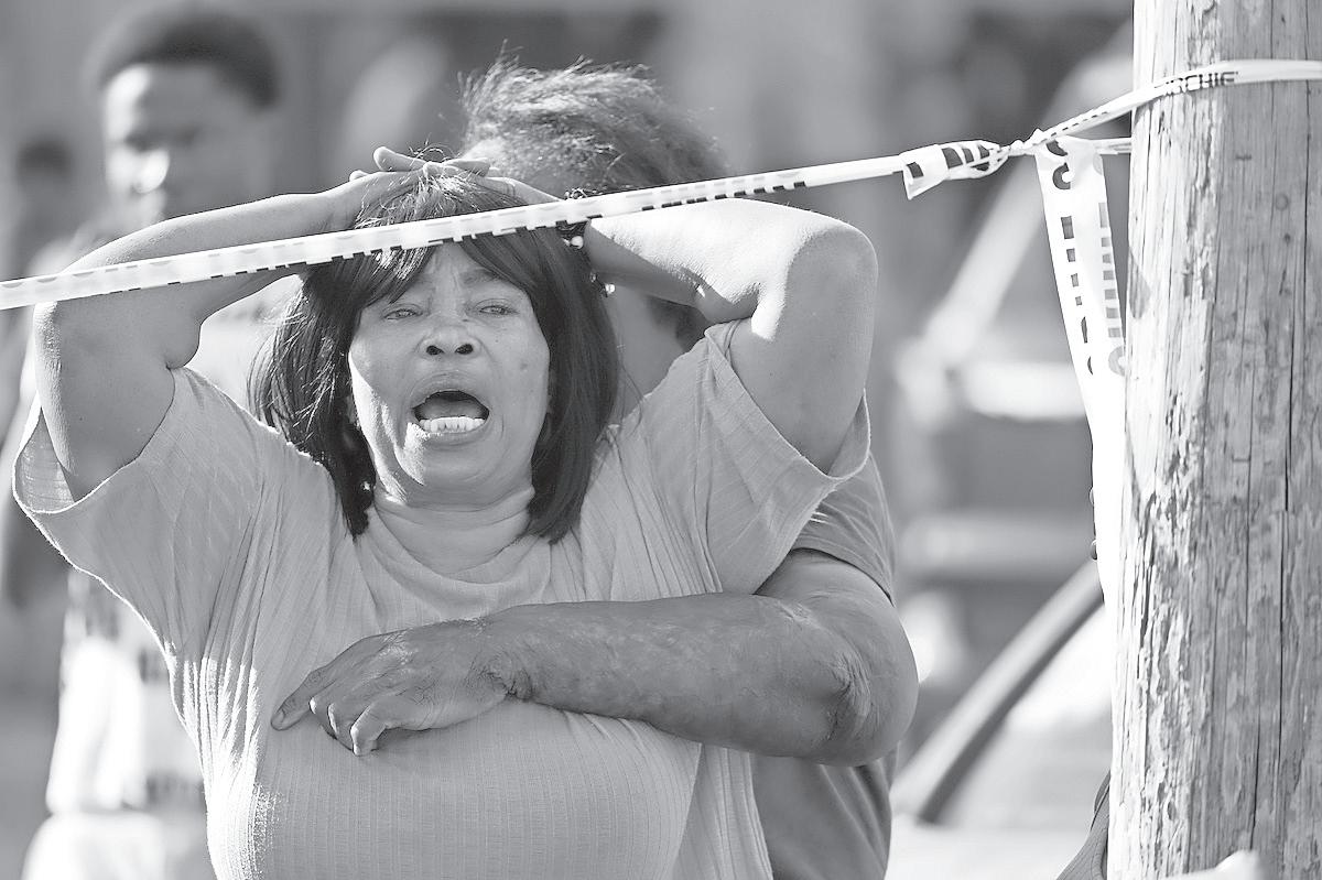 BEREAVED loved ones at the scene where a police reserve officer was shot dead along with one of his attackers as he tried to make a bank deposit at the RBC branch in Palmdale yesterday.