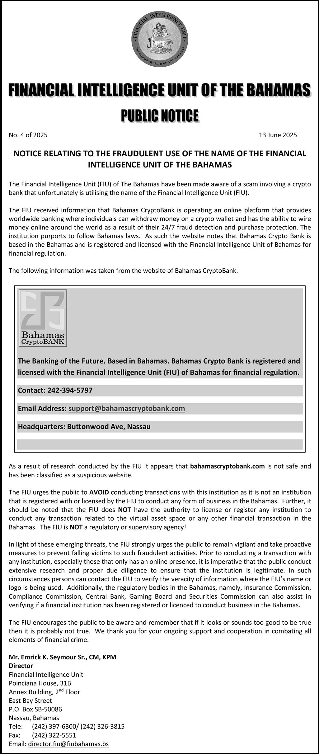 NOTICE is hereby given that MICHAEL JOHN MCCAFFREY of #127 S Ocean Road, Nassau, The Bahamas is applying to the Minister responsible for Nationality and Citizenship, for Registration Naturalization as a citizen of The Bahamas, and that any person who knows any reason why registration/ naturalization should not be granted, should send a written and signed statement of the facts within twenty-eight days from the 10th day of June 2025 to the Minister responsible for nationality and Citizenship, P.O. Box N-7147, Nassau, New Providence, The Bahamas.