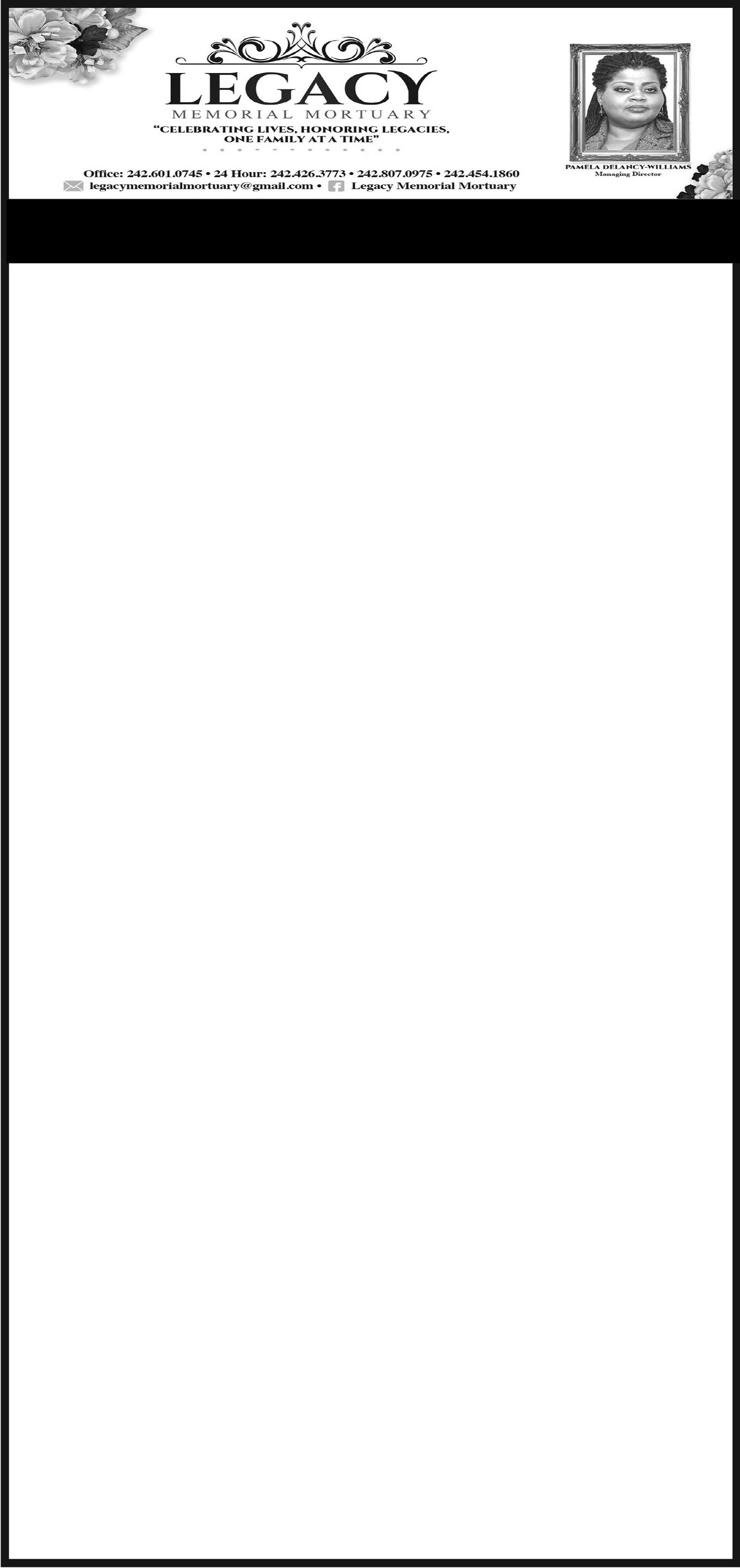 Precious memories will forever linger in the heart of his loved ones. He is survived by his estranged wife: Vanria Rolle; children: Patrick & Jewel Rolle, Shelley Moseley, Deloris Marie, Theresa Rolle-Mounsey (deceased), Fredricka & Kim Rolle, Sandra & Marcel Wilkinson, Sammy Rolle, Marvin Rolle Sr., W/Cpl 2228 Lesia Rolle, P/ Cpl 907 Roscoe & Keisha Rolle, Wendal & Ruth Stuart, Leslie Bannister; sisters: Benedictine Sister Clare Rolle, Elizabeth Miller & Dorothy Russell; brothers: Peter & Clifford Rahming, Vernal, Hubert & Adington Rolle (deceased); sisters-inlaw: Pearl Rahming, Pauline Rolle, Kathlean & Helena Stubbs, Annie Nora Burrows; brother-in-law: Clayton Stuart; son-in-law: Permanent Secretary Neil Campbell; nieces: Kathrine Hepburn, Ann Coakley, Janet Wallace, Monique Stevenson, Glemous Damus, Melissa, Bernadette, Shelly, Lucille, Esther & Cassandra Rolle, Stephanie Edwards, Madline Obas, Andrea Francis, Adwina Black, Madelyn Turnquest, Willamae Thompson, Karen Pruden, Jean Fergson, Paulette, Joan, Deborah & Patrice Rahming, Carol Howard, Vitamae Spells, Patricia Stubbs, Cynthia Bassie, Shirley Barnes & Marlena Roker, Magnola Romer, Beverley & Jean Bowles, Gayle Rolle, Suzette Laing, Marva Jones, Judith Henfield, Clothilda Whyms, Juliette McCafferty, Christabelle Saunders, Brenda, Carolyn, Theresa Stuart, Rosalie Simmions, Annabelle Burrows, Una Bain, Dr. Verna Price, Leda Edwards, Pamela Collins, Kayla Moore, Elaine Stuart, Ethilda Hendfield, Philippa Miller, Joyann & Marcia Stuart, Deralyn Brooks, Olive, Tiffany & Tangia Burrows, Vanessa Albury; nephews: Stephen, Hubert Jr., Terrance Sr., Willard, Felix & Philip Rolle, Roscoe Strachan, Robert & Earnest Frazer, Dwight, Dewitt, Derek & Fr. Anselm Russell, Christopher Miller, Christopher & Marco Rolle, Clifford, Peter, Preston Rahming. Valentino Clyde, Ryan, Patrick Stuart, Virgil, Fred, John, Harold, Henderson, Sidney, Antonio Whitney Stubbs, Don &Yorick Butler, McCarrol Bowles, Vincent Edwards & Bro. Shane Price, Cpl 2184 Terrance Burrows, Emmette & Kevin Burrows, Cameron Albury; grandchildren: Nejeeba, Nejah & Nejaiah Campbell, Marvin Jr., Simone, Selena, Sasha, Tracy, Vandalee & Marley Rolle, Delaree Stuart-Hunt, Tamika, Lestia & Leslie Jr., Wendal Jr., Wendeisha, Tinaz, Travis Stuart, Kesare & Roscoe Rolle Jr., Ned Joseph, Nicara & Luca Bowles, Andira Burrows, Kamard Burrows, Cindy Bullard (deceased), Shaniuque, Shantora, Nikkita Taylor, Clyde, Sertara, Joshua, Ayden Wilkinson, Patrice & Mario Pratt, Leroy & Tyren Bowleg, Evelyn & Errington Mosley, Curtisha & Sterling Albury, Stephen Sweeting, Theresa & Duran Cash, Albetha Boothe, Bertie
