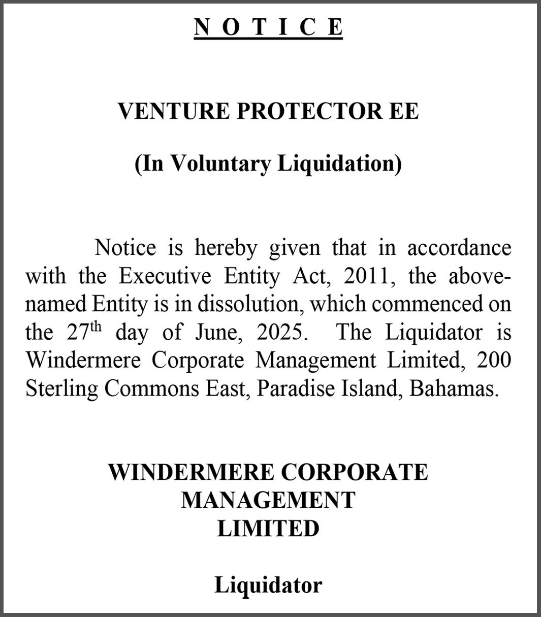 Notice is hereby given that, in accordance with Section 138 (4) of the International Business Companies Act, (No.45 of 2000), VIOLET CAPITAL CORPORATION (the “Company”) is in dissolution. The date of commencement of the dissolution is 26th June, 2025. Mr. Stephane Masson is the Liquidator and can be contacted at c/o Kaleso S.A., Rue de Bourg 30, 1003 Lausanne (Vaud), Switzerland. All persons having claims against the above-named Company are required to send their names, addresses and particulars of their debts or claims to the Liquidator before 26th July, 2025.