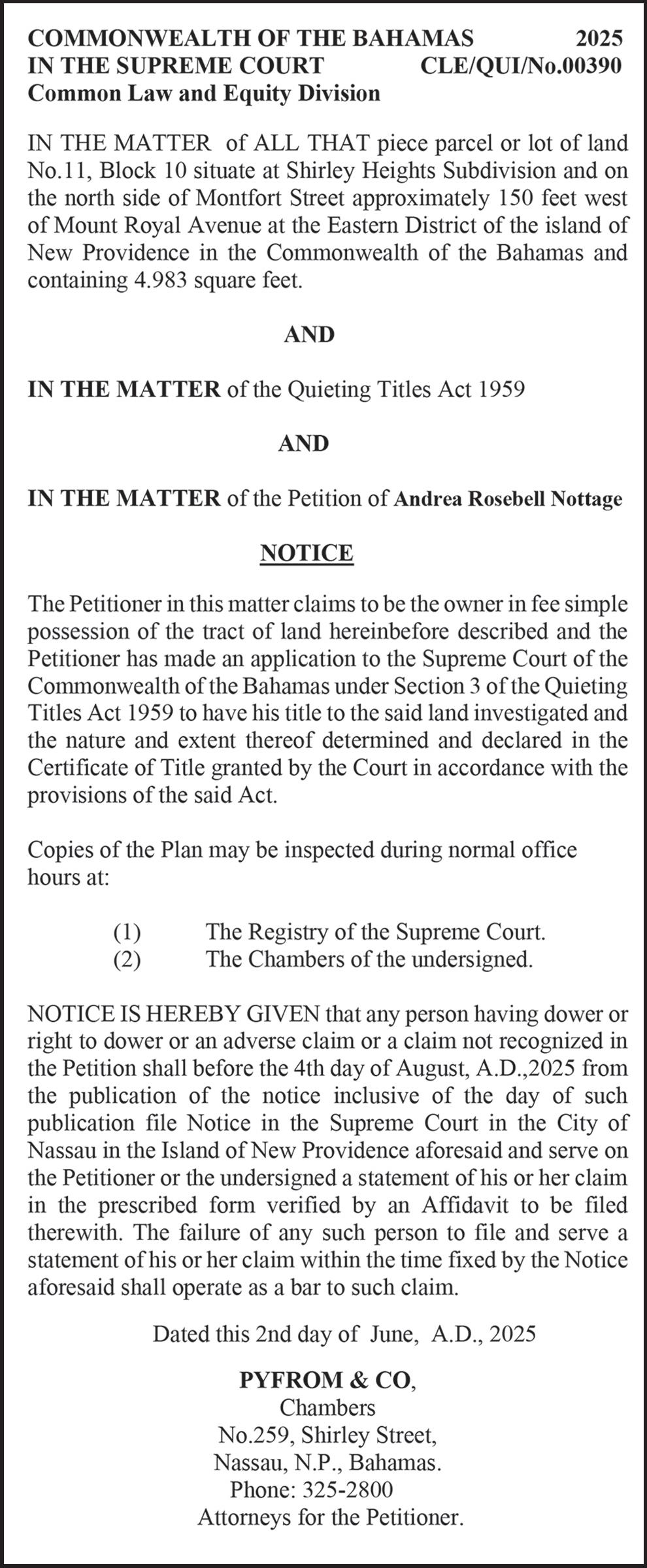 CHELEX JOSEPH of Family Street off Soldier Road, New Providence, Bahamas is applying to the Minister responsible for Nationality and Citizenship, for Registration Naturalization as a citizen of The Bahamas, and that any person who knows any reason why registration/ naturalization should not be granted, should send a written and signed statement of the facts within twenty-eight days from the 23rd day of June 2025 to the Minister responsible for nationality and Citizenship, P.O. Box N-7147, Nassau, New Providence, The Bahamas.