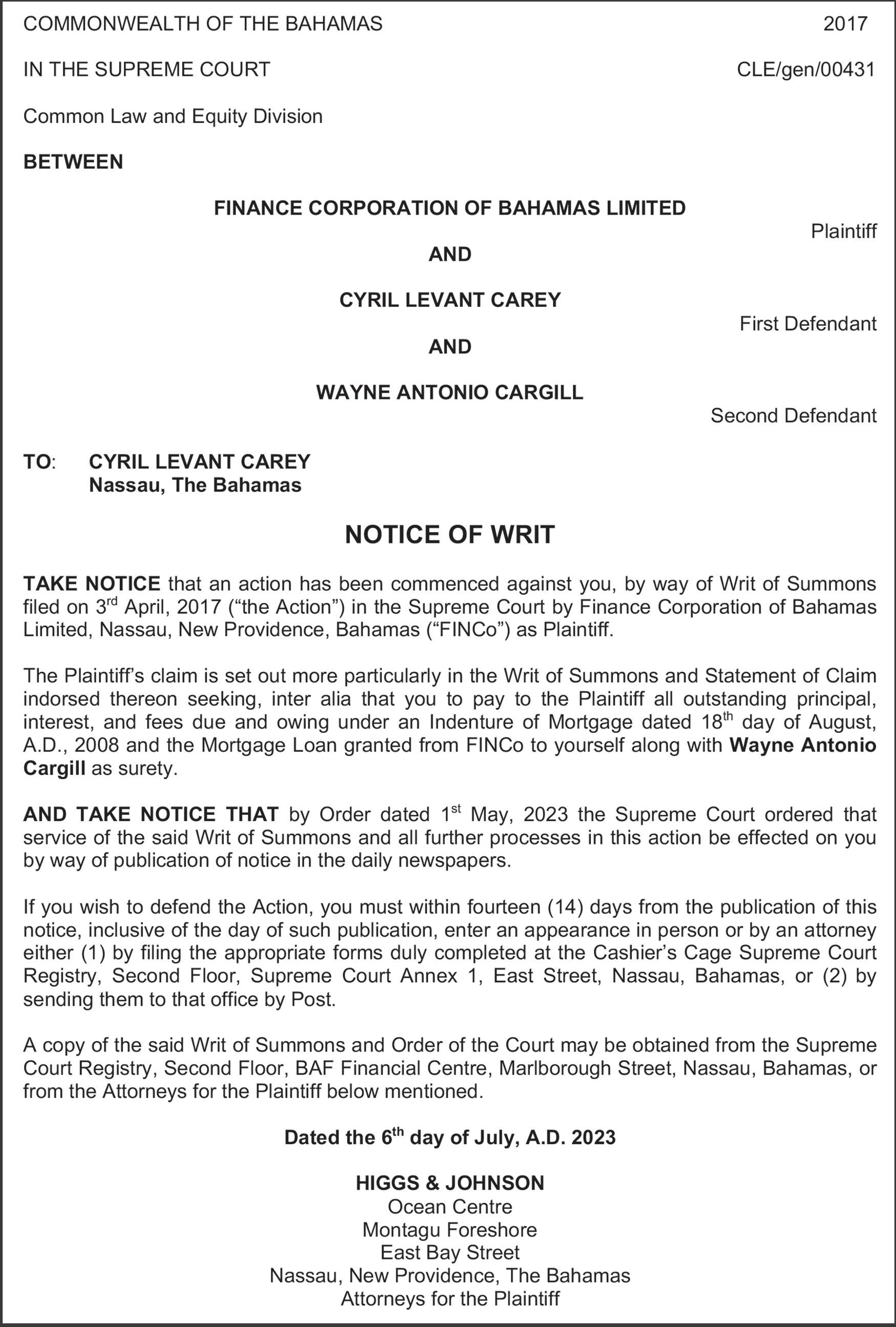 NOTICE is hereby given that SYDNEY NELSON, of #7 Ringwood Drive Arden Forest, New Providence, The Bahamas applying to the Minister responsible for Nationality and Citizenship, for Registration Naturalization as a citizen of The Bahamas, and that any person who knows any reason why registration/naturalization should not be granted, should send a written and signed statement of the facts within twenty-eight days from the 30th day of July 2023 to the Minister responsible for nationality and Citizenship, P.O. Box N-7147, Nassau, New Providence, The Bahamas.
