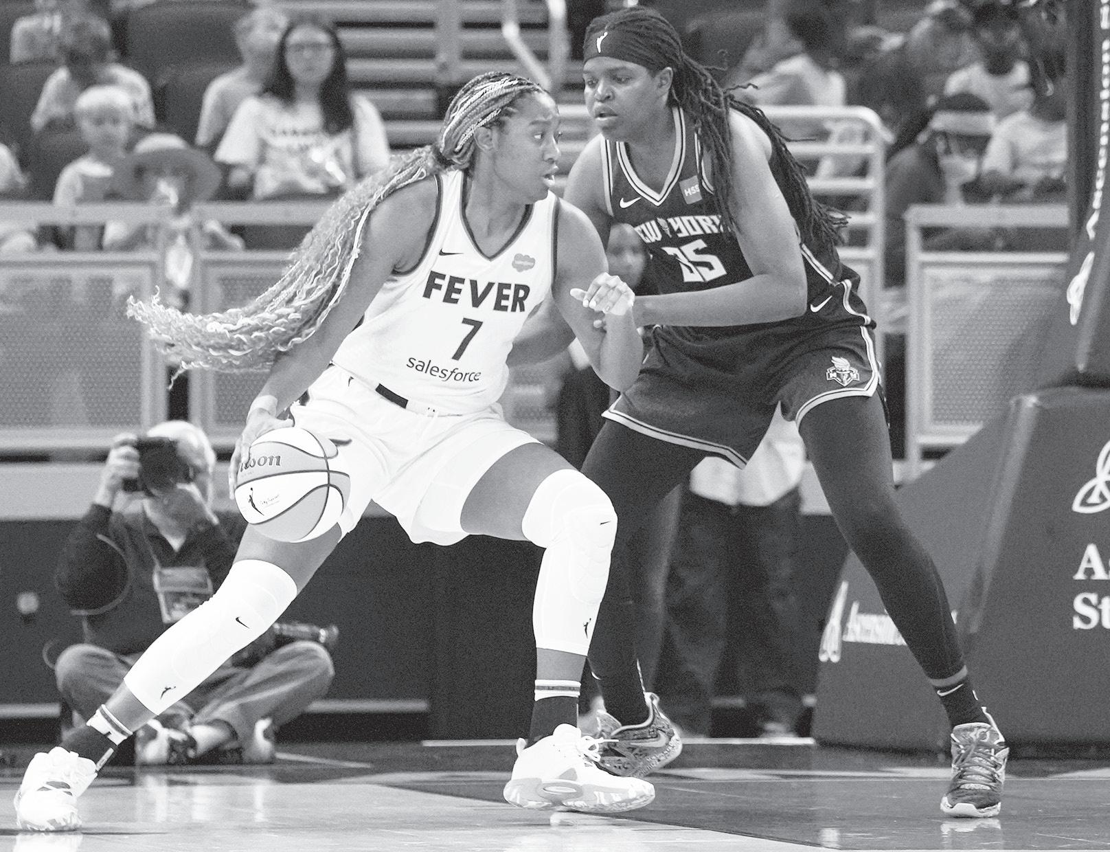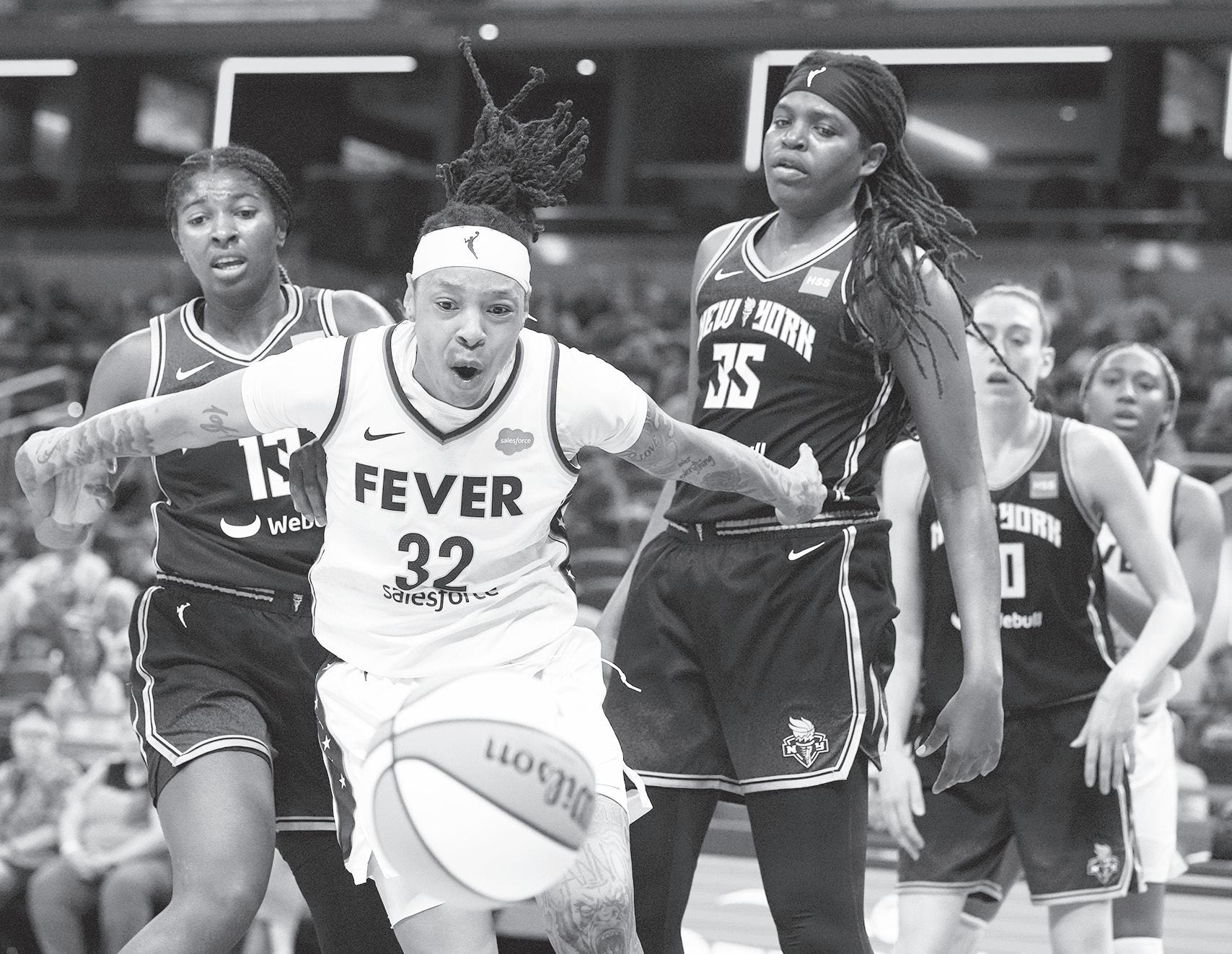 FEVER forward Emma Cannon (32) holds back Liberty guard Jocelyn Willoughby (13) and forward Jonquel Jones (35) as the ball goes out-ofbounds in the second half of a WNBA basketball game in Indianapolis yesterday.