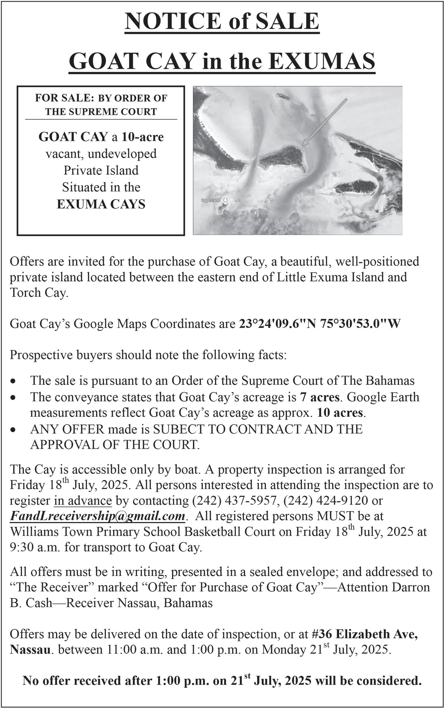 The ten-acre island, located off Williams Town at the south-eastern end of Exuma, is set to be sold-off by Mr Cash in a snap auction with all bids due to be submitted by a tight 1pm deadline this upcoming Monday, July 21. Potential