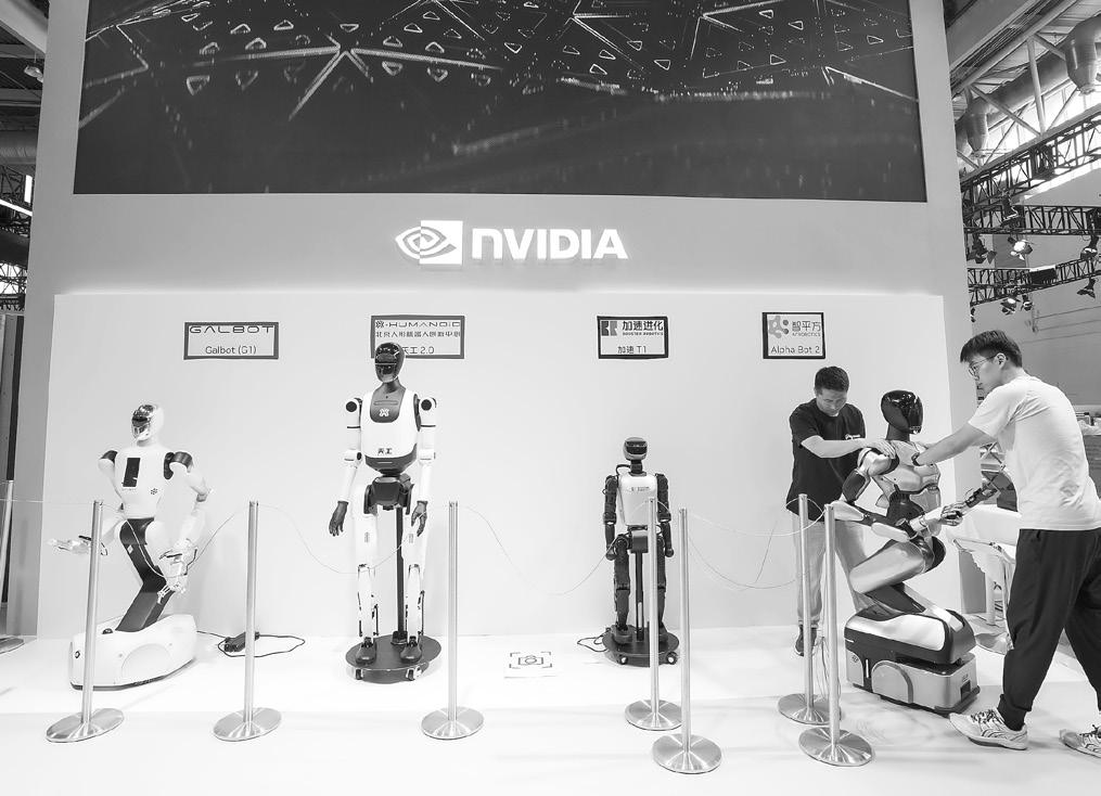 IN this photo released by Xinhua News Agency, workers set up a robot at the booth of Nvidia ahead of the upcoming third China International Supply Chain Expo (CISCE) in Beijing, on July 14, 2025. Photo:Ju Huanzong/AP