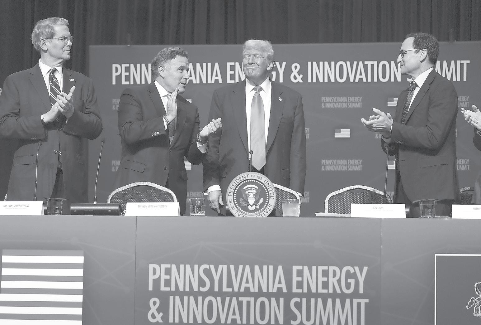 PRESIDENT Donald Trump arrives to speak at the “Inaugural Pennsylvania Energy and Innovation Event” at Carnegie Mellon University, Tuesday, July 15, 2025, in Pittsburgh. Standing with the President are from left, Treasury Secretary Scott Bessent, Sen. Dave McCormick, R-Pa., Trump and Jon Gray, President and Chief Operating Officer, Blackstone. Photo:Evan Vucci/AP and other AI firms. It also sits in the middle of the prolific Marcellus Shale natural gas reservoir.