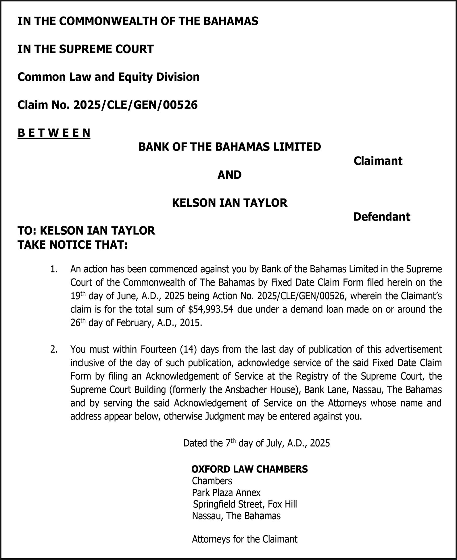 NOTICE is hereby given that LUKE GUERRA SILVA of #1 Charleston Lane, Old Fort Bay, Nassau, Bahamas, is applying to the Minister responsible for Nationality and Citizenship, for Registration Naturalization as a citizen of The Bahamas, and that any person who knows any reason why registration/ naturalization should not be granted, should send a written and signed statement of the facts within twenty-eight days from the 9th day of July 2025 to the Minister responsible for nationality and Citizenship, P.O. Box N-7147, Nassau, New Providence, The Bahamas.