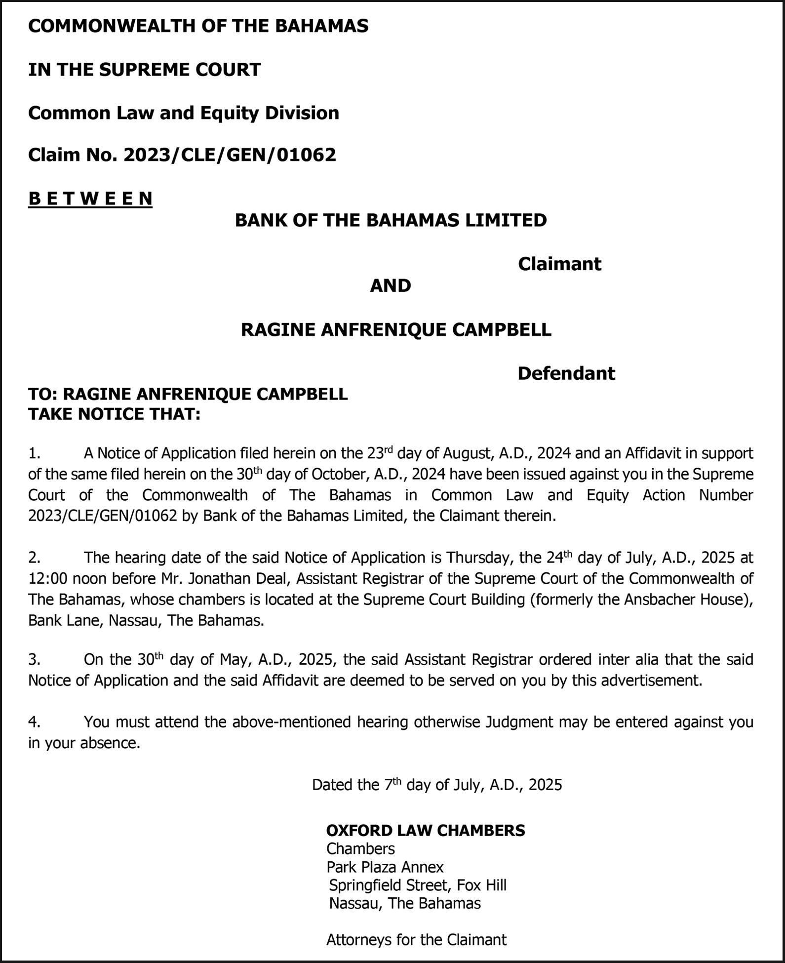 NOTICE is hereby given that RAMONE MILLER of Silver Gates Subdivision, St. Vincent Road, Nassau, The Bahamas, is applying to the Minister responsible for Nationality and Citizenship, for Registration Naturalization as a citizen of The Bahamas, and that any person who knows any reason why registration/naturalization should not be granted, should send a written and signed statement of the facts within twenty-eight days from the 16th day of July 2025 to the Minister responsible for nationality and Citizenship, P.O. Box N-7147, Nassau, New Providence, The Bahamas.