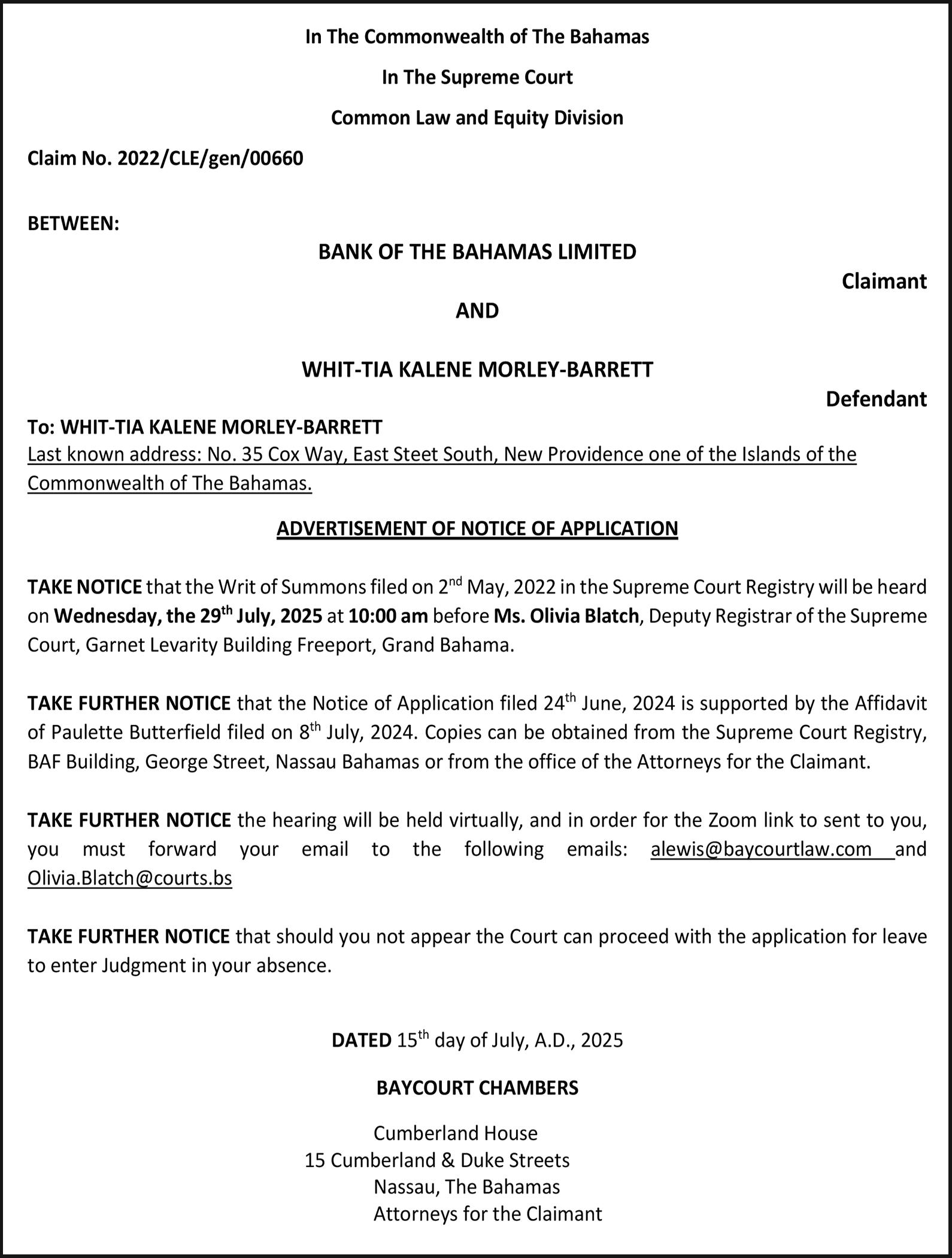 NOTICE is hereby given that SHANTEL BAILEY of Silver Gates Subdivision, St. Vincent Road, Nassau, The Bahamas, is applying to the Minister responsible for Nationality and Citizenship, for Registration Naturalization as a citizen of The Bahamas, and that any person who knows any reason why registration/naturalization should not be granted, should send a written and signed statement of the facts within twenty-eight days from the 16th day of July 2025 to the Minister responsible for nationality and Citizenship, P.O. Box N-7147, Nassau, New Providence, The Bahamas.